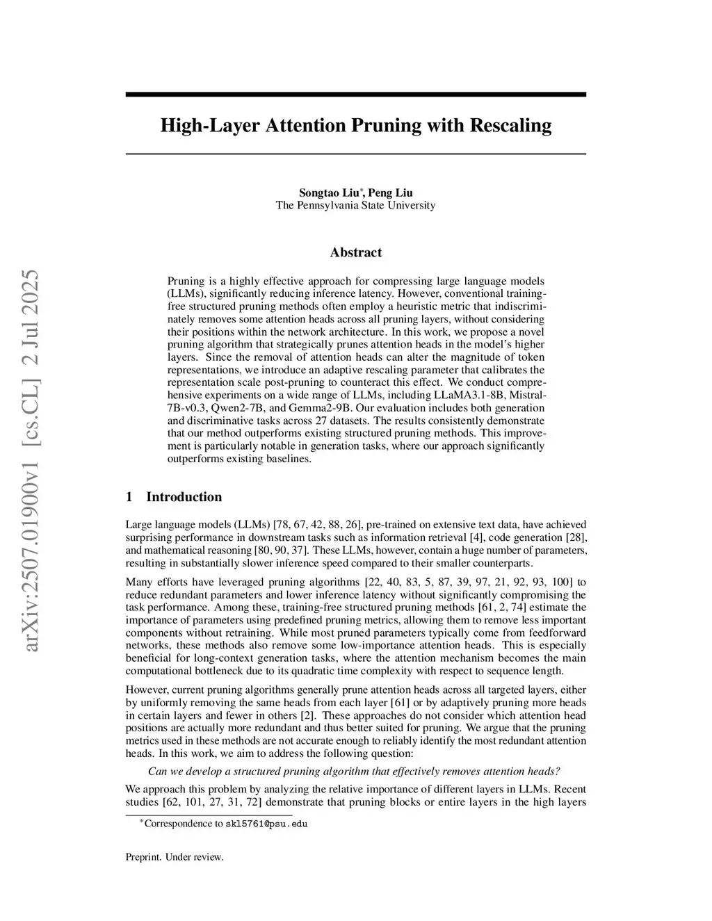 Pruning is a highly effective approach for compressing large language models (LLMs), significantly reducing inference latency. However, conventional training-free structured pruning methods often employ a heuristic metric that indiscriminately removes some attention heads across all pruning layers, without considering their positions within the network architecture. In this work, we propose a novel pruning algorithm that strategically prunes attention heads in the model's higher layers. Since the removal of attention heads can alter the magnitude of token representations, we introduce an adaptive rescaling parameter that calibrates the representation scale post-pruning to counteract this effect. We conduct comprehensive experiments on a wide range of LLMs, including LLaMA3.1-8B, Mistral-7B-v0.3, Qwen2-7B, and Gemma2-9B. Our evaluation includes both generation and discriminative tasks across 27 datasets. The results consistently demonstrate that our method outperforms existing structured pruning methods. This improvement is particularly notable in generation tasks, where our approach significantly outperforms existing baselines. Code is available atthis https URL.