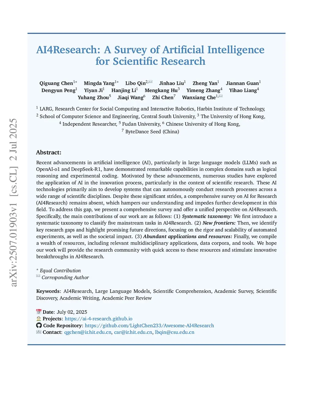 Recent advancements in artificial intelligence (AI), particularly in large language models (LLMs) such as OpenAI-o1 and DeepSeek-R1, have demonstrated remarkable capabilities in complex domains such as logical reasoning and experimental coding. Motivated by these advancements, numerous studies have explored the application of AI in the innovation process, particularly in the context of scientific research. These AI technologies primarily aim to develop systems that can autonomously conduct research processes across a wide range of scientific disciplines. Despite these significant strides, a comprehensive survey on AI for Research (AI4Research) remains absent, which hampers our understanding and impedes further development in this field. To address this gap, we present a comprehensive survey and offer a unified perspective on AI4Research. Specifically, the main contributions of our work are as follows: (1) Systematic taxonomy: We first introduce a systematic taxonomy to classify five mainstream tasks in AI4Research. (2) New frontiers: Then, we identify key research gaps and highlight promising future directions, focusing on the rigor and scalability of automated experiments, as well as the societal impact. (3) Abundant applications and resources: Finally, we compile a wealth of resources, including relevant multidisciplinary applications, data corpora, and tools. We hope our work will provide the research community with quick access to these resources and stimulate innovative breakthroughs in AI4Research.