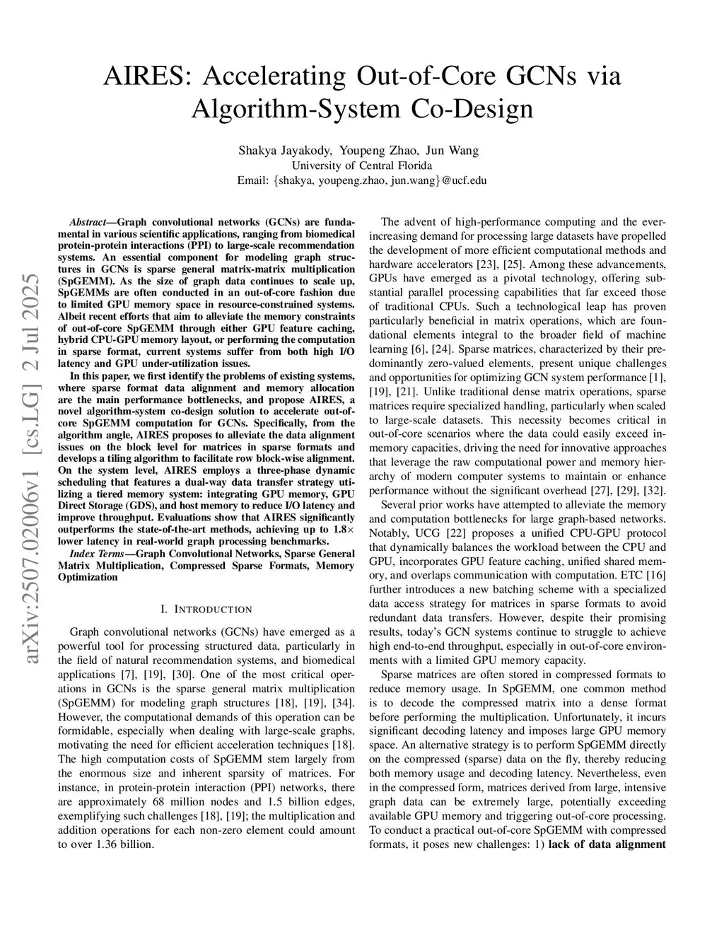 Graph convolutional networks (GCNs) are fundamental in various scientific applications, ranging from biomedical protein-protein interactions (PPI) to large-scale recommendation systems. An essential component for modeling graph structures in GCNs is sparse general matrix-matrix multiplication (SpGEMM). As the size of graph data continues to scale up, SpGEMMs are often conducted in an out-of-core fashion due to limited GPU memory space in resource-constrained systems. Albeit recent efforts that aim to alleviate the memory constraints of out-of-core SpGEMM through either GPU feature caching, hybrid CPU-GPU memory layout, or performing the computation in sparse format, current systems suffer from both high I/O latency and GPU under-utilization issues.In this paper, we first identify the problems of existing systems, where sparse format data alignment and memory allocation are the main performance bottlenecks, and propose AIRES, a novel algorithm-system co-design solution to accelerate out-of-core SpGEMM computation for GCNs. Specifically, from the algorithm angle, AIRES proposes to alleviate the data alignment issues on the block level for matrices in sparse formats and develops a tiling algorithm to facilitate row block-wise alignment. On the system level, AIRES employs a three-phase dynamic scheduling that features a dual-way data transfer strategy utilizing a tiered memory system: integrating GPU memory, GPU Direct Storage (GDS), and host memory to reduce I/O latency and improve throughput. Evaluations show that AIRES significantly outperforms the state-of-the-art methods, achieving up to 1.8x lower latency in real-world graph processing benchmarks.
