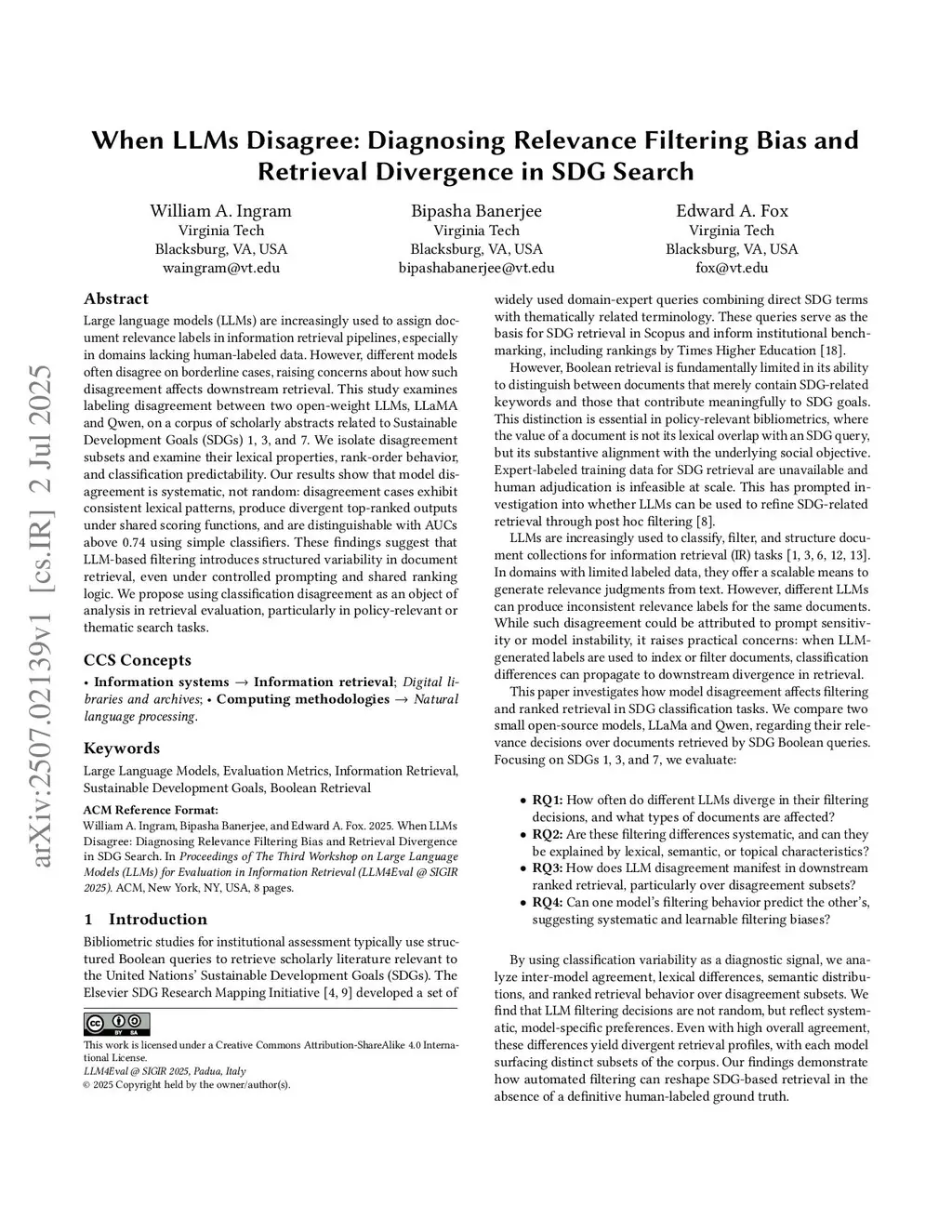 Large language models (LLMs) are increasingly used to assign document relevance labels in information retrieval pipelines, especially in domains lacking human-labeled data. However, different models often disagree on borderline cases, raising concerns about how such disagreement affects downstream retrieval. This study examines labeling disagreement between two open-weight LLMs, LLaMA and Qwen, on a corpus of scholarly abstracts related to Sustainable Development Goals (SDGs) 1, 3, and 7. We isolate disagreement subsets and examine their lexical properties, rank-order behavior, and classification predictability. Our results show that model disagreement is systematic, not random: disagreement cases exhibit consistent lexical patterns, produce divergent top-ranked outputs under shared scoring functions, and are distinguishable with AUCs above 0.74 using simple classifiers. These findings suggest that LLM-based filtering introduces structured variability in document retrieval, even under controlled prompting and shared ranking logic. We propose using classification disagreement as an object of analysis in retrieval evaluation, particularly in policy-relevant or thematic search tasks.