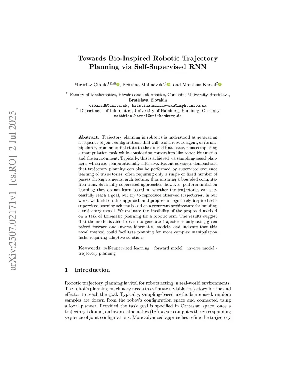 Towards Bio-Inspired Robotic Trajectory Planning via Self-Supervised RNN