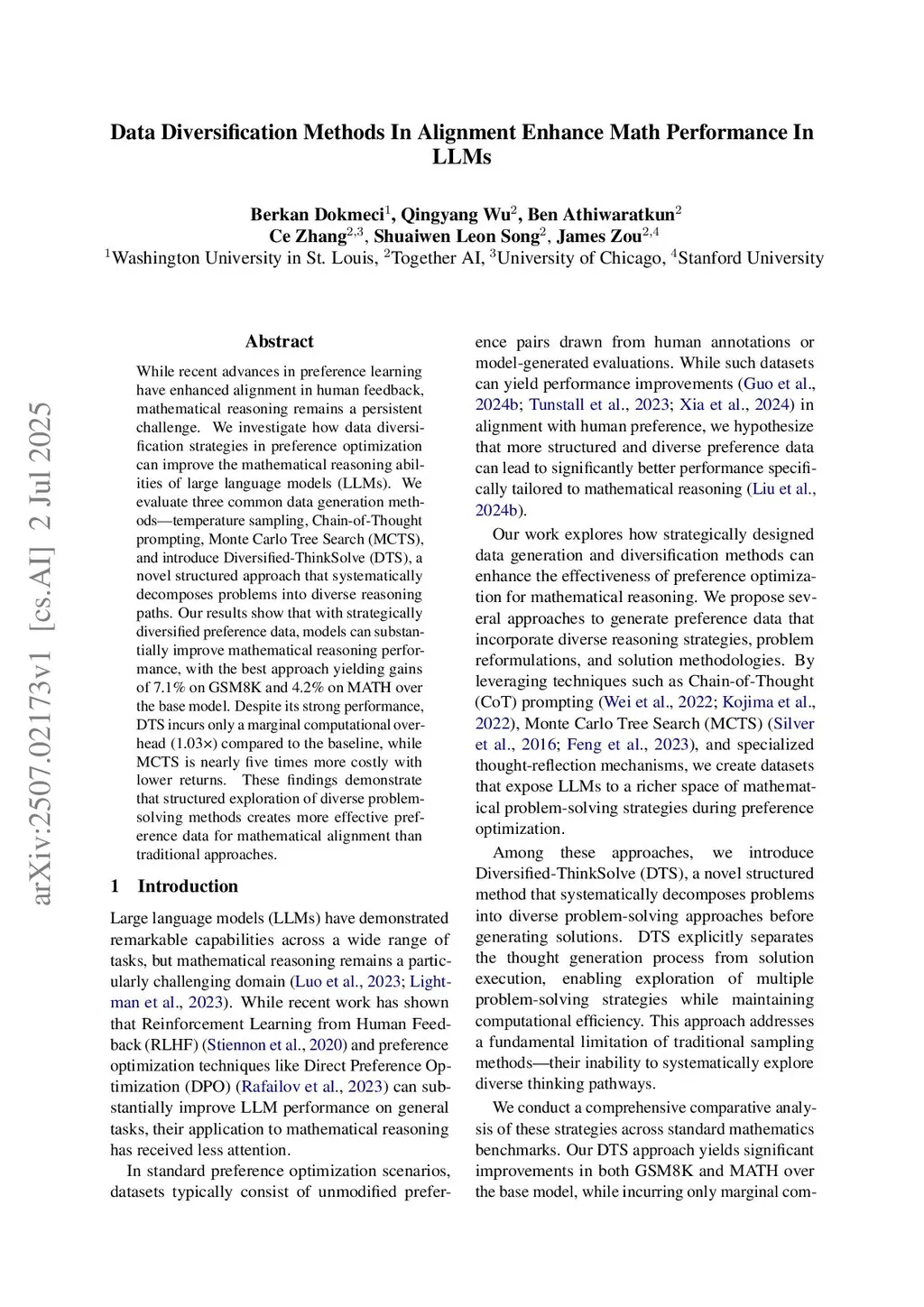While recent advances in preference learning have enhanced alignment in human feedback, mathematical reasoning remains a persistent challenge. We investigate how data diversification strategies in preference optimization can improve the mathematical reasoning abilities of large language models (LLMs). We evaluate three common data generation methods: temperature sampling, Chain-of-Thought prompting, and Monte Carlo Tree Search (MCTS), and introduce Diversified-ThinkSolve (DTS), a novel structured approach that systematically decomposes problems into diverse reasoning paths. Our results show that with strategically diversified preference data, models can substantially improve mathematical reasoning performance, with the best approach yielding gains of 7.1% on GSM8K and 4.2% on MATH over the base model. Despite its strong performance, DTS incurs only a marginal computational overhead (1.03x) compared to the baseline, while MCTS is nearly five times more costly with lower returns. These findings demonstrate that structured exploration of diverse problem-solving methods creates more effective preference data for mathematical alignment than traditional approaches.