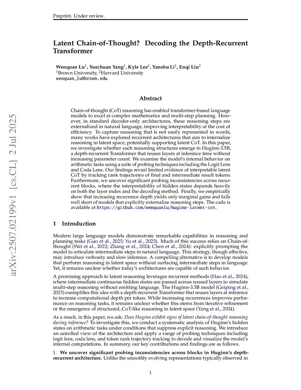 Chain-of-thought (CoT) reasoning has enabled transformer-based language models to excel at complex mathematics and multi-step planning. However, in standard decoder-only architectures, these reasoning steps are externalized in natural language, improving interpretability at the cost of efficiency. To capture reasoning that is not easily represented in words, many works have explored recurrent architectures that aim to internalize reasoning in latent space, potentially supporting latent CoT. In this paper, we investigate whether such reasoning structures emerge in Huginn-3.5B, a depth-recurrent Transformer that reuses layers at inference time without increasing parameter count. We examine the model's internal behavior on arithmetic tasks using a suite of probing techniques including the Logit Lens and Coda Lens. Our findings reveal limited evidence of interpretable latent CoT by tracking rank trajectories of final and intermediate result tokens. Furthermore, we uncover significant probing inconsistencies across recurrent blocks, where the interpretability of hidden states depends heavily on both the layer index and the decoding method. Finally, we empirically show that increasing recurrence depth yields only marginal gains and falls well short of models that explicitly externalize reasoning steps. The code is available atthis https URL.