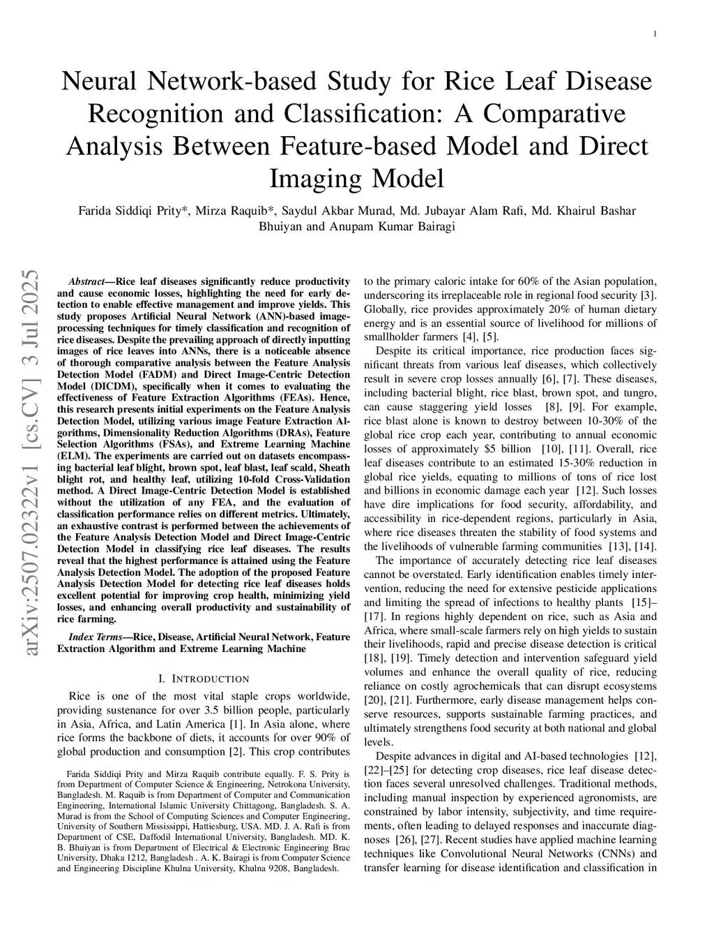 Neural Network-based Study for Rice Leaf Disease Recognition and Classification: A Comparative Analysis Between Feature-based Model and Direct Imaging Model