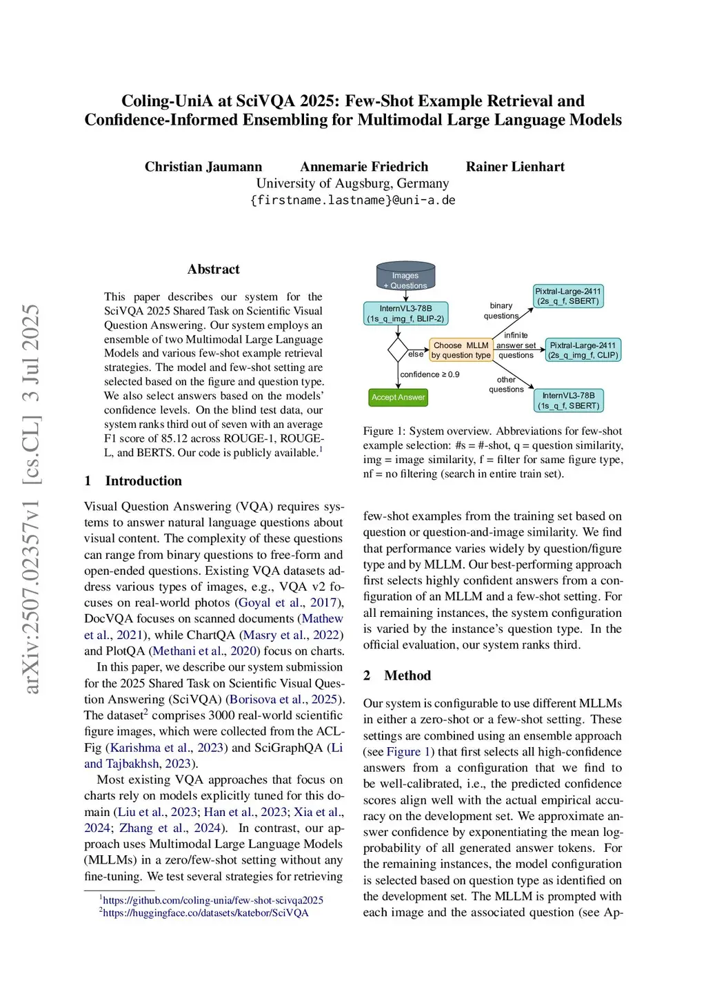 Coling-UniA at SciVQA 2025: Few-Shot Example Retrieval and Confidence-Informed Ensembling for Multimodal Large Language Models
