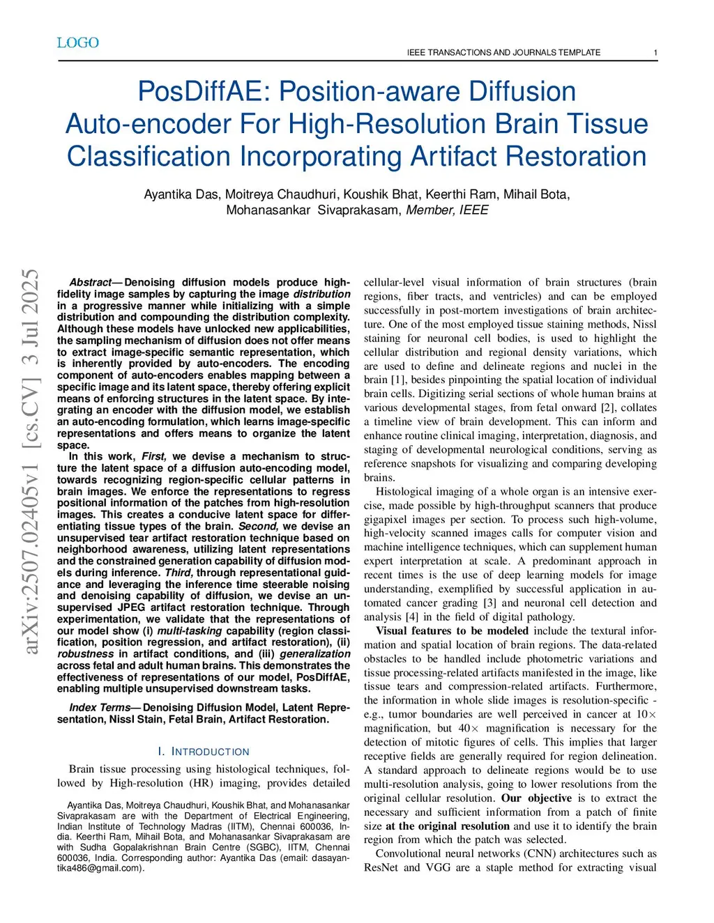 PosDiffAE: Position-aware Diffusion Auto-encoder For High-Resolution Brain Tissue Classification Incorporating Artifact Restoration