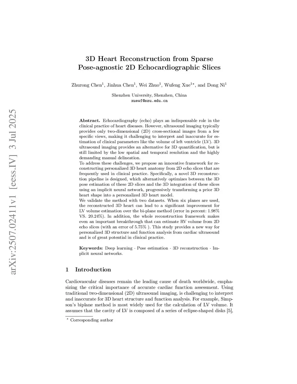 Echocardiography (echo) plays an indispensable role in the clinical practice of heart diseases. However, ultrasound imaging typically provides only two-dimensional (2D) cross-sectional images from a few specific views, making it challenging to interpret and inaccurate for estimation of clinical parameters like the volume of left ventricle (LV). 3D ultrasound imaging provides an alternative for 3D quantification, but is still limited by the low spatial and temporal resolution and the highly demanding manual delineation.To address these challenges, we propose an innovative framework for reconstructing personalized 3D heart anatomy from 2D echo slices that are frequently used in clinical practice. Specifically, a novel 3D reconstruction pipeline is designed, which alternatively optimizes between the 3D pose estimation of these 2D slices and the 3D integration of these slices using an implicit neural network, progressively transforming a prior 3D heart shape into a personalized 3D heart model.We validate the method with two datasets. When six planes are used, the reconstructed 3D heart can lead to a significant improvement for LV volume estimation over the bi-plane method (error in percent: 1.98\% VS. 20.24\%). In addition, the whole reconstruction framework makes even an important breakthrough that can estimate RV volume from 2D echo slices (with an error of 5.75\% ). This study provides a new way for personalized 3D structure and function analysis from cardiac ultrasound and is of great potential in clinical practice.
