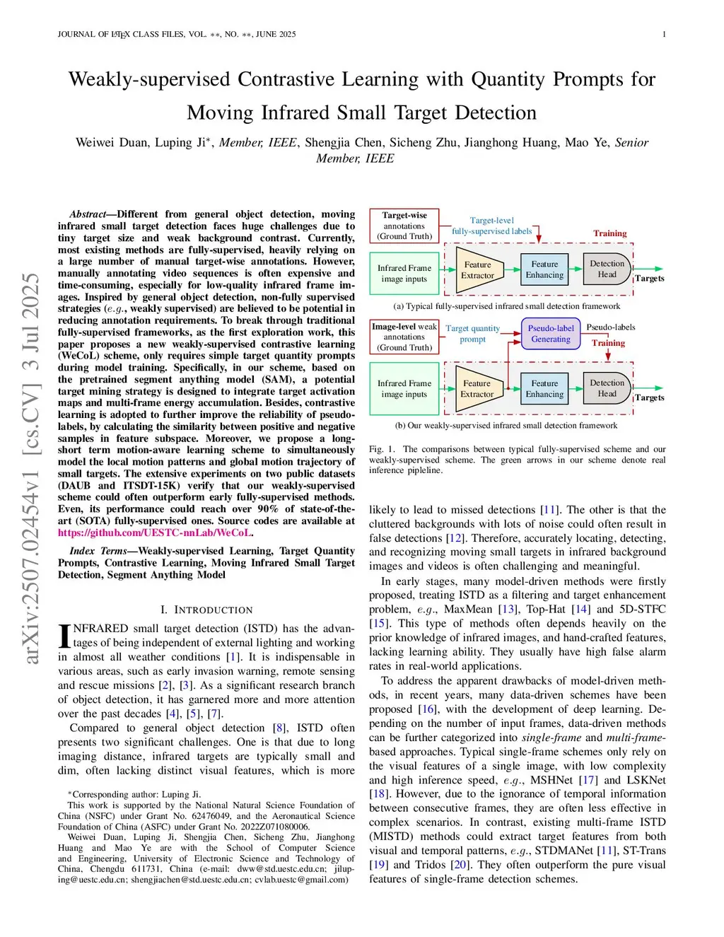 Different from general object detection, moving infrared small target detection faces huge challenges due to tiny target size and weak backgroundthis http URL, most existing methods are fully-supervised, heavily relying on a large number of manual target-wise annotations. However, manually annotating video sequences is often expensive and time-consuming, especially for low-quality infrared frame images. Inspired by general object detection, non-fully supervised strategies (, weakly supervised) are believed to be potential in reducing annotation requirements. To break through traditional fully-supervised frameworks, as the first exploration work, this paper proposes a new weakly-supervised contrastive learning (WeCoL) scheme, only requires simple target quantity prompts during modelthis http URL, in our scheme, based on the pretrained segment anything model (SAM), a potential target mining strategy is designed to integrate target activation maps and multi-frame energythis http URL, contrastive learning is adopted to further improve the reliability of pseudo-labels, by calculating the similarity between positive and negative samples in featurethis http URL, we propose a long-short term motion-aware learning scheme to simultaneously model the local motion patterns and global motion trajectory of smallthis http URLextensive experiments on two public datasets (DAUB and ITSDT-15K) verify that our weakly-supervised scheme could often outperform early fully-supervised methods. Even, its performance could reach over 90\% of state-of-the-art (SOTA) fully-supervised ones.