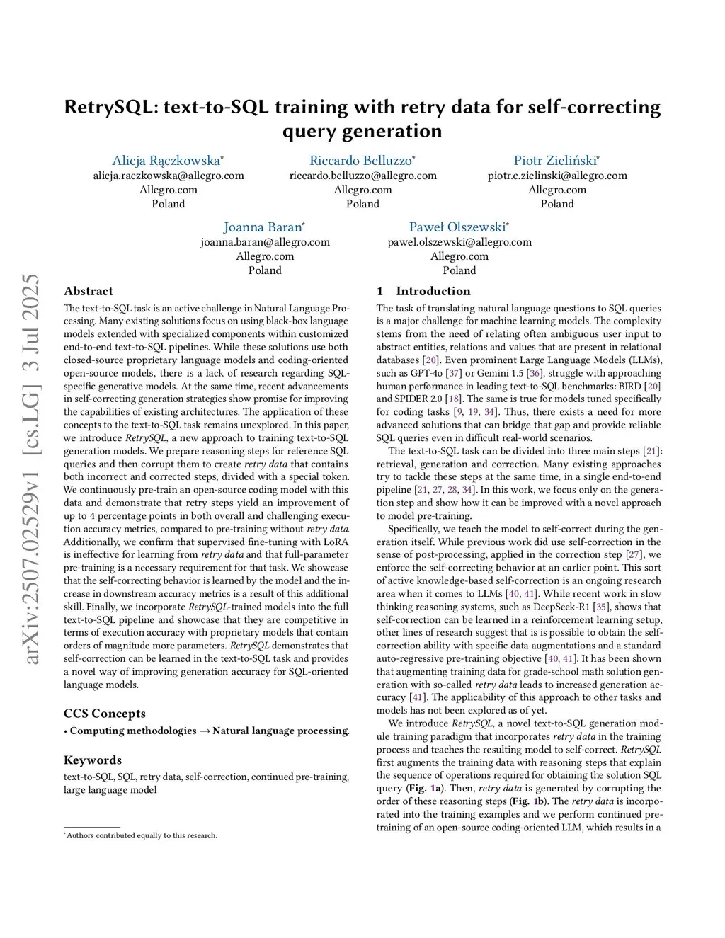 RetrySQL: text-to-SQL training with retry data for self-correcting query generation