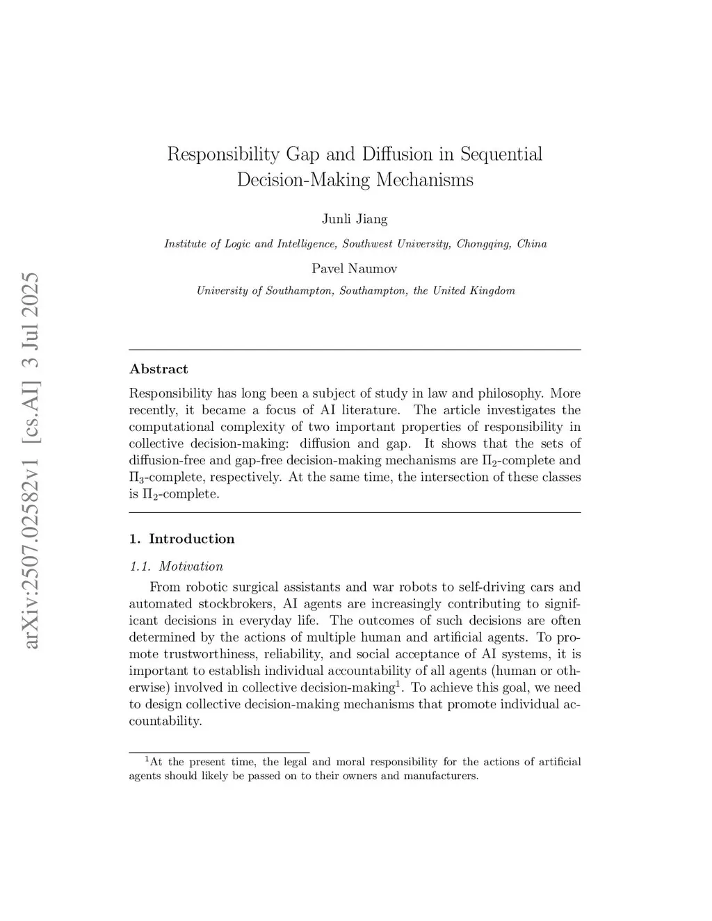 Responsibility has long been a subject of study in law and philosophy. More recently, it became a focus of AI literature. The article investigates the computational complexity of two important properties of responsibility in collective decision-making: diffusion and gap. It shows that the sets of diffusion-free and gap-free decision-making mechanisms are -complete and -complete, respectively. At the same time, the intersection of these classes is -complete.