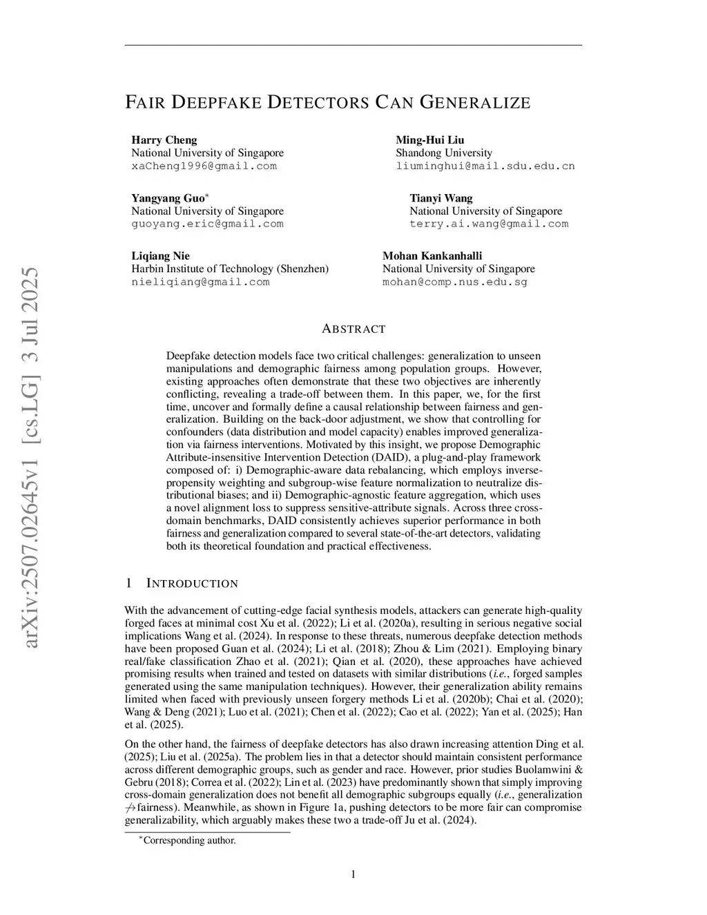 Deepfake detection models face two critical challenges: generalization to unseen manipulations and demographic fairness among population groups. However, existing approaches often demonstrate that these two objectives are inherently conflicting, revealing a trade-off between them. In this paper, we, for the first time, uncover and formally define a causal relationship between fairness and generalization. Building on the back-door adjustment, we show that controlling for confounders (data distribution and model capacity) enables improved generalization via fairness interventions. Motivated by this insight, we propose Demographic Attribute-insensitive Intervention Detection (DAID), a plug-and-play framework composed of: i) Demographic-aware data rebalancing, which employs inverse-propensity weighting and subgroup-wise feature normalization to neutralize distributional biases; and ii) Demographic-agnostic feature aggregation, which uses a novel alignment loss to suppress sensitive-attribute signals. Across three cross-domain benchmarks, DAID consistently achieves superior performance in both fairness and generalization compared to several state-of-the-art detectors, validating both its theoretical foundation and practical effectiveness.