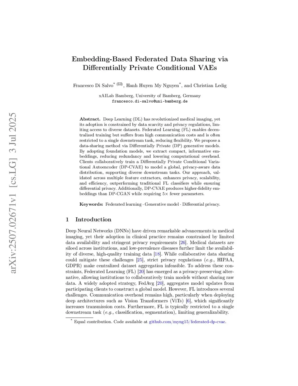 Deep Learning (DL) has revolutionized medical imaging, yet its adoption is constrained by data scarcity and privacy regulations, limiting access to diverse datasets. Federated Learning (FL) enables decentralized training but suffers from high communication costs and is often restricted to a single downstream task, reducing flexibility. We propose a data-sharing method via Differentially Private (DP) generative models. By adopting foundation models, we extract compact, informative embeddings, reducing redundancy and lowering computational overhead. Clients collaboratively train a Differentially Private Conditional Variational Autoencoder (DP-CVAE) to model a global, privacy-aware data distribution, supporting diverse downstream tasks. Our approach, validated across multiple feature extractors, enhances privacy, scalability, and efficiency, outperforming traditional FL classifiers while ensuring differential privacy. Additionally, DP-CVAE produces higher-fidelity embeddings than DP-CGAN while requiring fewer parameters.