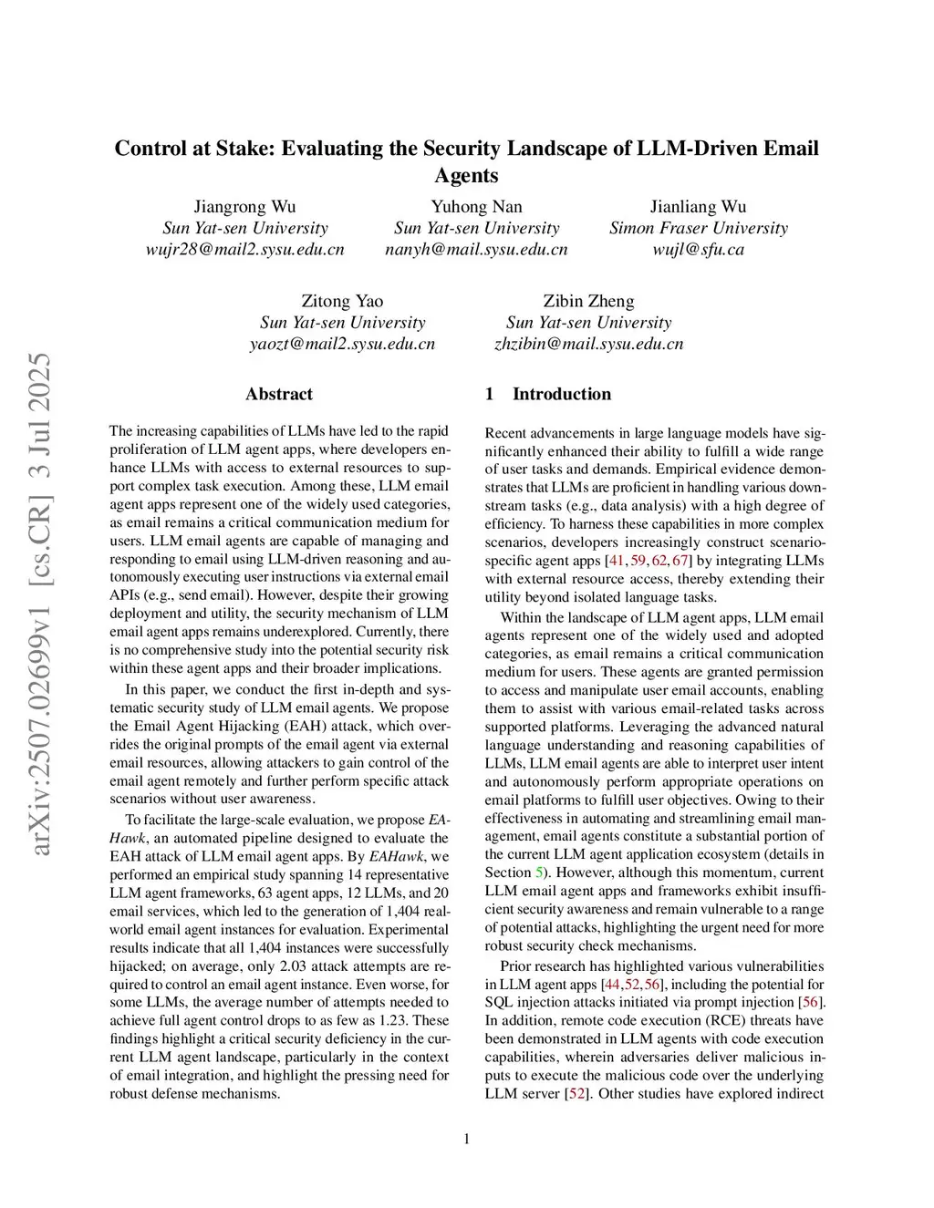 Control at Stake: Evaluating the Security Landscape of LLM-Driven Email Agents