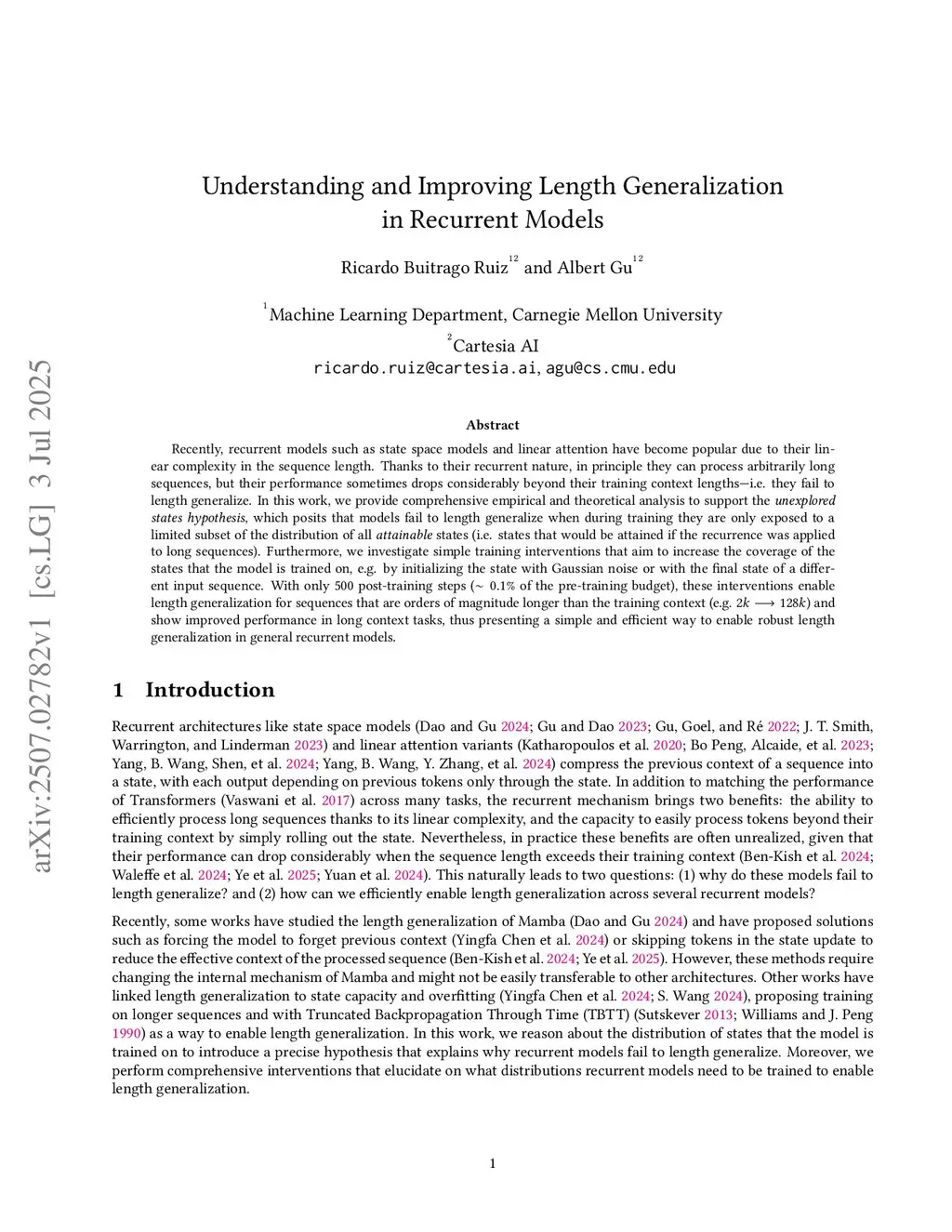 Recently, recurrent models such as state space models and linear attention have become popular due to their linear complexity in the sequence length. Thanks to their recurrent nature, in principle they can process arbitrarily long sequences, but their performance sometimes drops considerably beyond their training context lengths-i.e. they fail to length generalize. In this work, we provide comprehensive empirical and theoretical analysis to support the unexplored states hypothesis, which posits that models fail to length generalize when during training they are only exposed to a limited subset of the distribution of all attainable states (i.e. states that would be attained if the recurrence was applied to long sequences). Furthermore, we investigate simple training interventions that aim to increase the coverage of the states that the model is trained on, e.g. by initializing the state with Gaussian noise or with the final state of a different input sequence. With only 500 post-training steps ( of the pre-training budget), these interventions enable length generalization for sequences that are orders of magnitude longer than the training context (e.g. ) and show improved performance in long context tasks, thus presenting a simple and efficient way to enable robust length generalization in general recurrent models.