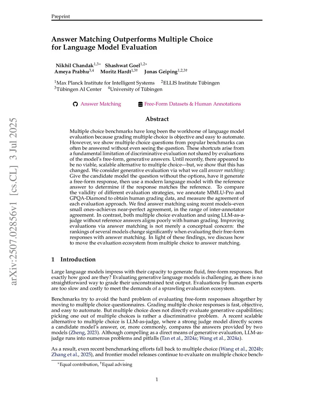 Multiple choice benchmarks have long been the workhorse of language model evaluation because grading multiple choice is objective and easy to automate. However, we show multiple choice questions from popular benchmarks can often be answered without even seeing the question. These shortcuts arise from a fundamental limitation of discriminative evaluation not shared by evaluations of the model's free-form, generative answers. Until recently, there appeared to be no viable, scalable alternative to multiple choice--but, we show that this has changed. We consider generative evaluation via what we call answer matching: Give the candidate model the question without the options, have it generate a free-form response, then use a modern language model with the reference answer to determine if the response matches the reference. To compare the validity of different evaluation strategies, we annotate MMLU-Pro and GPQA-Diamond to obtain human grading data, and measure the agreement of each evaluation approach. We find answer matching using recent models--even small ones--achieves near-perfect agreement, in the range of inter-annotator agreement. In contrast, both multiple choice evaluation and using LLM-as-a-judge without reference answers aligns poorly with human grading. Improving evaluations via answer matching is not merely a conceptual concern: the rankings of several models change significantly when evaluating their free-form responses with answer matching. In light of these findings, we discuss how to move the evaluation ecosystem from multiple choice to answer matching.