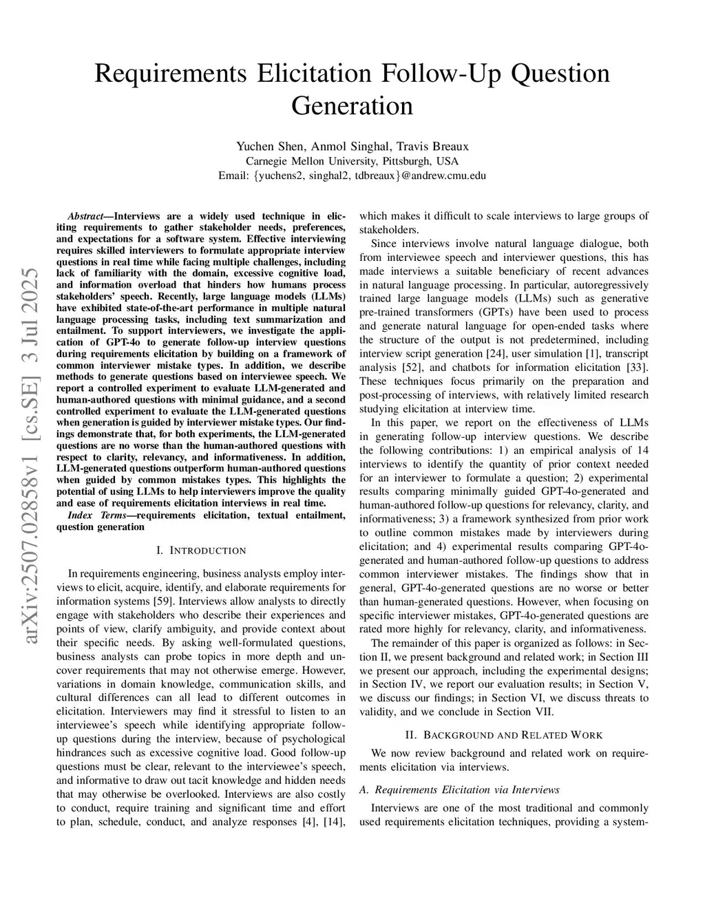 Interviews are a widely used technique in eliciting requirements to gather stakeholder needs, preferences, and expectations for a software system. Effective interviewing requires skilled interviewers to formulate appropriate interview questions in real time while facing multiple challenges, including lack of familiarity with the domain, excessive cognitive load, and information overload that hinders how humans process stakeholders' speech. Recently, large language models (LLMs) have exhibited state-of-the-art performance in multiple natural language processing tasks, including text summarization and entailment. To support interviewers, we investigate the application of GPT-4o to generate follow-up interview questions during requirements elicitation by building on a framework of common interviewer mistake types. In addition, we describe methods to generate questions based on interviewee speech. We report a controlled experiment to evaluate LLM-generated and human-authored questions with minimal guidance, and a second controlled experiment to evaluate the LLM-generated questions when generation is guided by interviewer mistake types. Our findings demonstrate that, for both experiments, the LLM-generated questions are no worse than the human-authored questions with respect to clarity, relevancy, and informativeness. In addition, LLM-generated questions outperform human-authored questions when guided by common mistakes types. This highlights the potential of using LLMs to help interviewers improve the quality and ease of requirements elicitation interviews in real time.