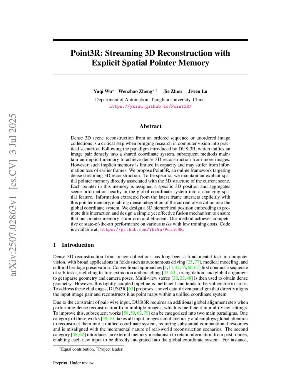 Dense 3D scene reconstruction from an ordered sequence or unordered image collections is a critical step when bringing research in computer vision into practical scenarios. Following the paradigm introduced by DUSt3R, which unifies an image pair densely into a shared coordinate system, subsequent methods maintain an implicit memory to achieve dense 3D reconstruction from more images. However, such implicit memory is limited in capacity and may suffer from information loss of earlier frames. We propose Point3R, an online framework targeting dense streaming 3D reconstruction. To be specific, we maintain an explicit spatial pointer memory directly associated with the 3D structure of the current scene. Each pointer in this memory is assigned a specific 3D position and aggregates scene information nearby in the global coordinate system into a changing spatial feature. Information extracted from the latest frame interacts explicitly with this pointer memory, enabling dense integration of the current observation into the global coordinate system. We design a 3D hierarchical position embedding to promote this interaction and design a simple yet effective fusion mechanism to ensure that our pointer memory is uniform and efficient. Our method achieves competitive or state-of-the-art performance on various tasks with low training costs. Code is available at: this https URL.
