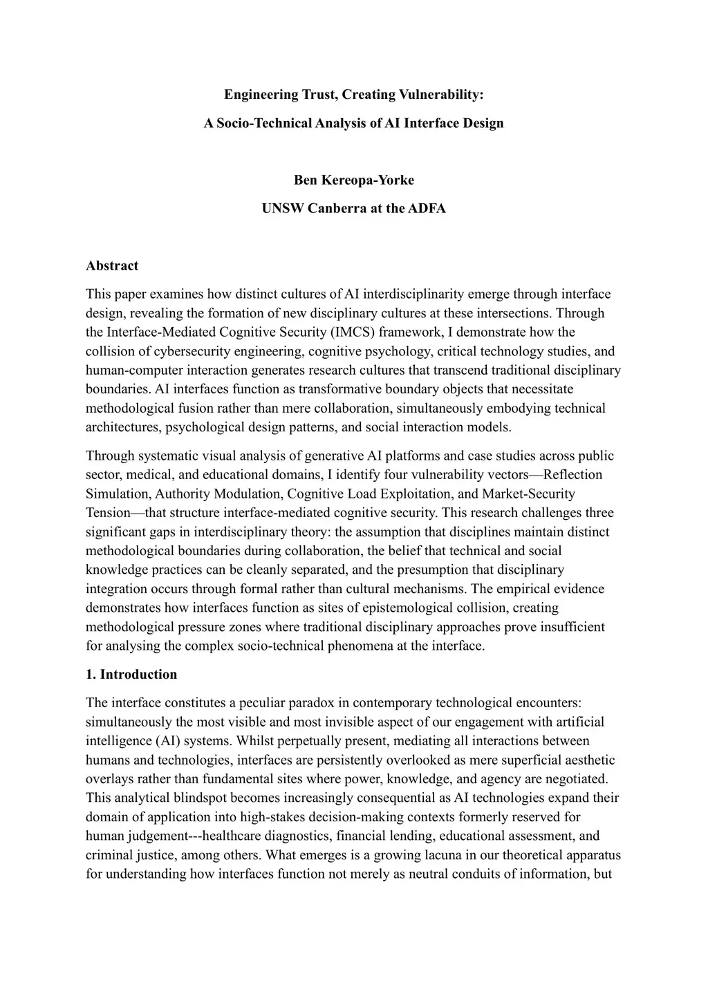 This paper examines how distinct cultures of AI interdisciplinarity emerge through interface design, revealing the formation of new disciplinary cultures at these intersections. Through the Interface-Mediated Cognitive Security (IMCS) framework, I demonstrate how the collision of cybersecurity engineering, cognitive psychology, critical technology studies, and human-computer interaction generates research cultures that transcend traditional disciplinary boundaries. AI interfaces function as transformative boundary objects that necessitate methodological fusion rather than mere collaboration, simultaneously embodying technical architectures, psychological design patterns, and social interaction models. Through systematic visual analysis of generative AI platforms and case studies across public sector, medical, and educational domains, I identify four vulnerability vectors, Reflection Simulation, Authority Modulation, Cognitive Load Exploitation, and Market-Security Tension, that structure interface-mediated cognitive security. This research challenges three significant gaps in interdisciplinary theory: the assumption that disciplines maintain distinct methodological boundaries during collaboration, the belief that technical and social knowledge practices can be cleanly separated, and the presumption that disciplinary integration occurs through formal rather than cultural mechanisms. The empirical evidence demonstrates how interfaces function as sites of epistemological collision, creating methodological pressure zones where traditional disciplinary approaches prove insufficient for analysing the complex socio-technical phenomena at the interface.