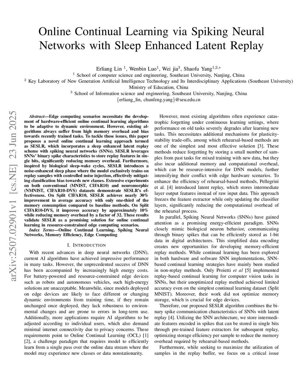 Edge computing scenarios necessitate the development of hardware-efficient online continual learning algorithms to be adaptive to dynamic environment. However, existing algorithms always suffer from high memory overhead and bias towards recently trained tasks. To tackle these issues, this paper proposes a novel online continual learning approach termed as SESLR, which incorporates a sleep enhanced latent replay scheme with spiking neural networks (SNNs). SESLR leverages SNNs' binary spike characteristics to store replay features in single bits, significantly reducing memory overhead. Furthermore, inspired by biological sleep-wake cycles, SESLR introduces a noise-enhanced sleep phase where the model exclusively trains on replay samples with controlled noise injection, effectively mitigating classification bias towards new classes. Extensive experiments on both conventional (MNIST, CIFAR10) and neuromorphic (NMNIST, CIFAR10-DVS) datasets demonstrate SESLR's effectiveness. On Split CIFAR10, SESLR achieves nearly 30% improvement in average accuracy with only one-third of the memory consumption compared to baseline methods. On Split CIFAR10-DVS, it improves accuracy by approximately 10% while reducing memory overhead by a factor of 32. These results validate SESLR as a promising solution for online continual learning in resource-constrained edge computing scenarios.