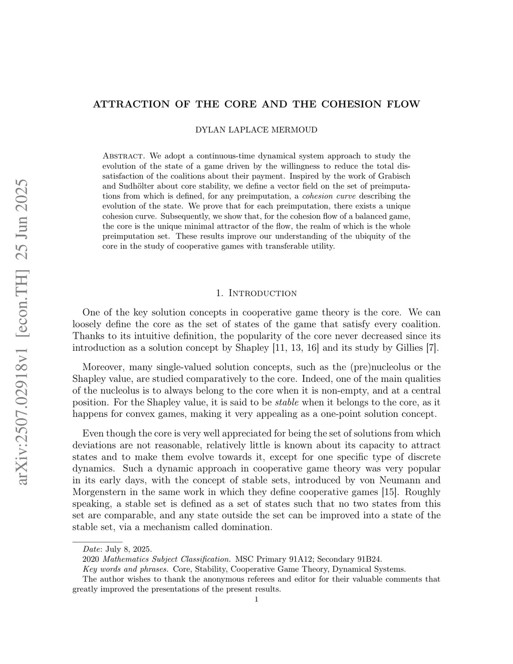 We adopt a continuous-time dynamical system approach to study the evolution of the state of a game driven by the willingness to reduce the total dissatisfaction of the coalitions about their payment. Inspired by the work of Grabisch and Sudhölter about core stability, we define a vector field on the set of preimputations from which is defined, for any preimputation, a cohesion curve describing the evolution of the state. We prove that for each preimputation, there exists a unique cohesion curve. Subsequently, we show that, for the cohesion flow of a balanced game, the core is the unique minimal attractor of the flow, the realm of which is the whole preimputation set. These results improve our understanding of the ubiquity of the core in the study of cooperative games with transferable utility.