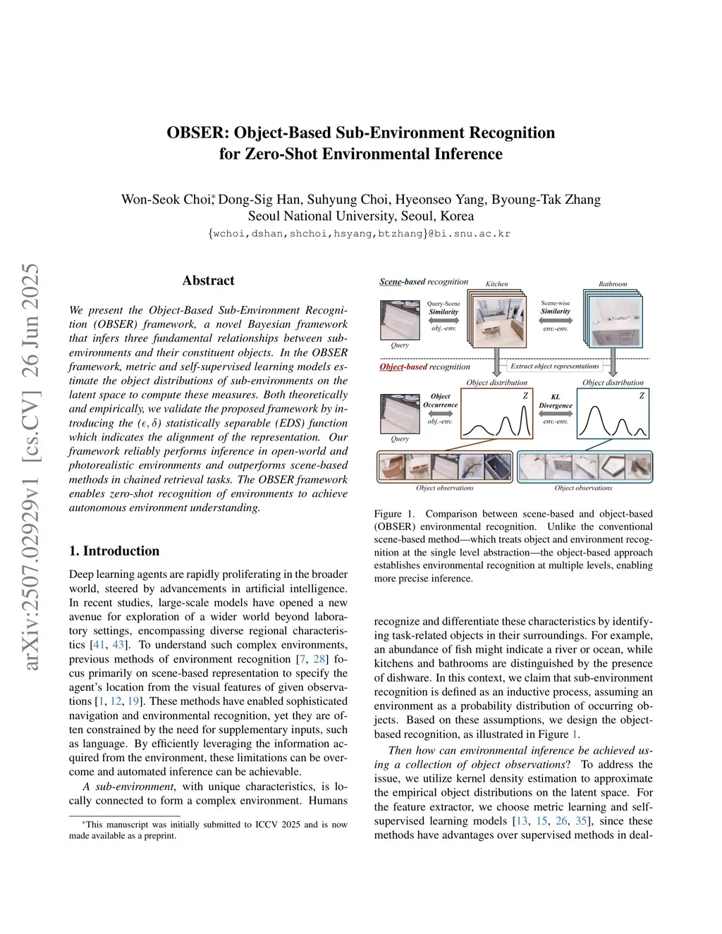 We present the Object-Based Sub-Environment Recognition (OBSER) framework, a novel Bayesian framework that infers three fundamental relationships between sub-environments and their constituent objects. In the OBSER framework, metric and self-supervised learning models estimate the object distributions of sub-environments on the latent space to compute these measures. Both theoretically and empirically, we validate the proposed framework by introducing the () statistically separable (EDS) function which indicates the alignment of the representation. Our framework reliably performs inference in open-world and photorealistic environments and outperforms scene-based methods in chained retrieval tasks. The OBSER framework enables zero-shot recognition of environments to achieve autonomous environment understanding.