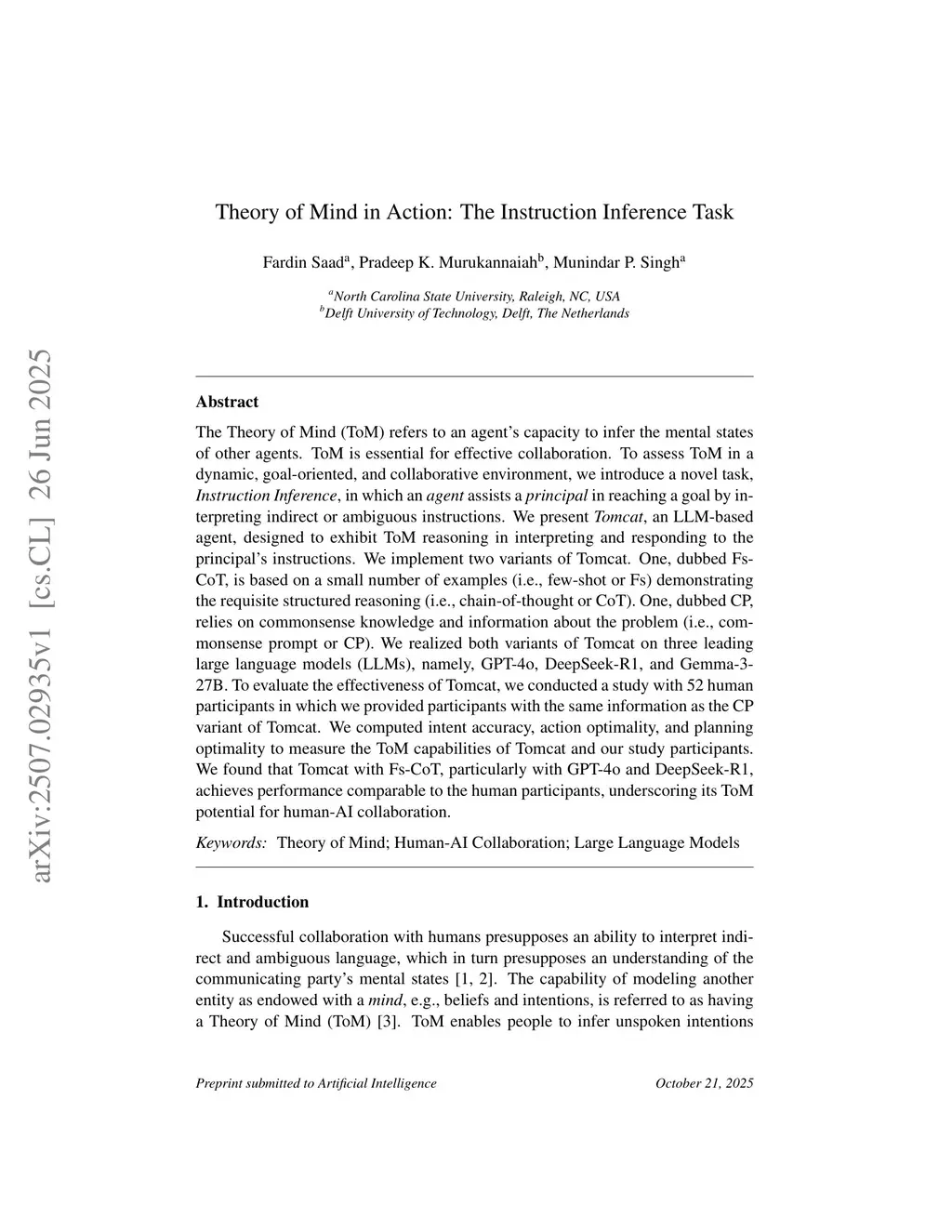 The Theory of Mind (ToM) refers to an agent's capacity to infer the mental states of other agents. ToM is essential for effective collaboration. To assess ToM in a dynamic, goal-oriented, and collaborative environment, we introduce a novel task, Instruction Inference, in which an agent assists a principal in reaching a goal by interpreting indirect or ambiguous instructions. We present Tomcat, an LLM-based agent, designed to exhibit ToM reasoning in interpreting and responding to the principal's instructions. We implement two variants of Tomcat. One, dubbed Fs-CoT, is based on a small number of examples (i.e., few-shot or Fs) demonstrating the requisite structured reasoning (i.e., chain-of-thought or CoT). One, dubbed CP, relies on commonsense knowledge and information about the problem (i.e., commonsense prompt or CP). We realized both variants of Tomcat on three leading large language models (LLMs), namely, GPT-4o, DeepSeek-R1, and Gemma-3-27B. To evaluate the effectiveness of Tomcat, we conducted a study with 52 human participants in which we provided participants with the same information as the CP variant of Tomcat. We computed intent accuracy, action optimality, and planning optimality to measure the ToM capabilities of Tomcat and our study participants. We found that Tomcat with Fs-CoT, particularly with GPT-4o and DeepSeek-R1, achieves performance comparable to the human participants, underscoring its ToM potential for human-AI collaboration.