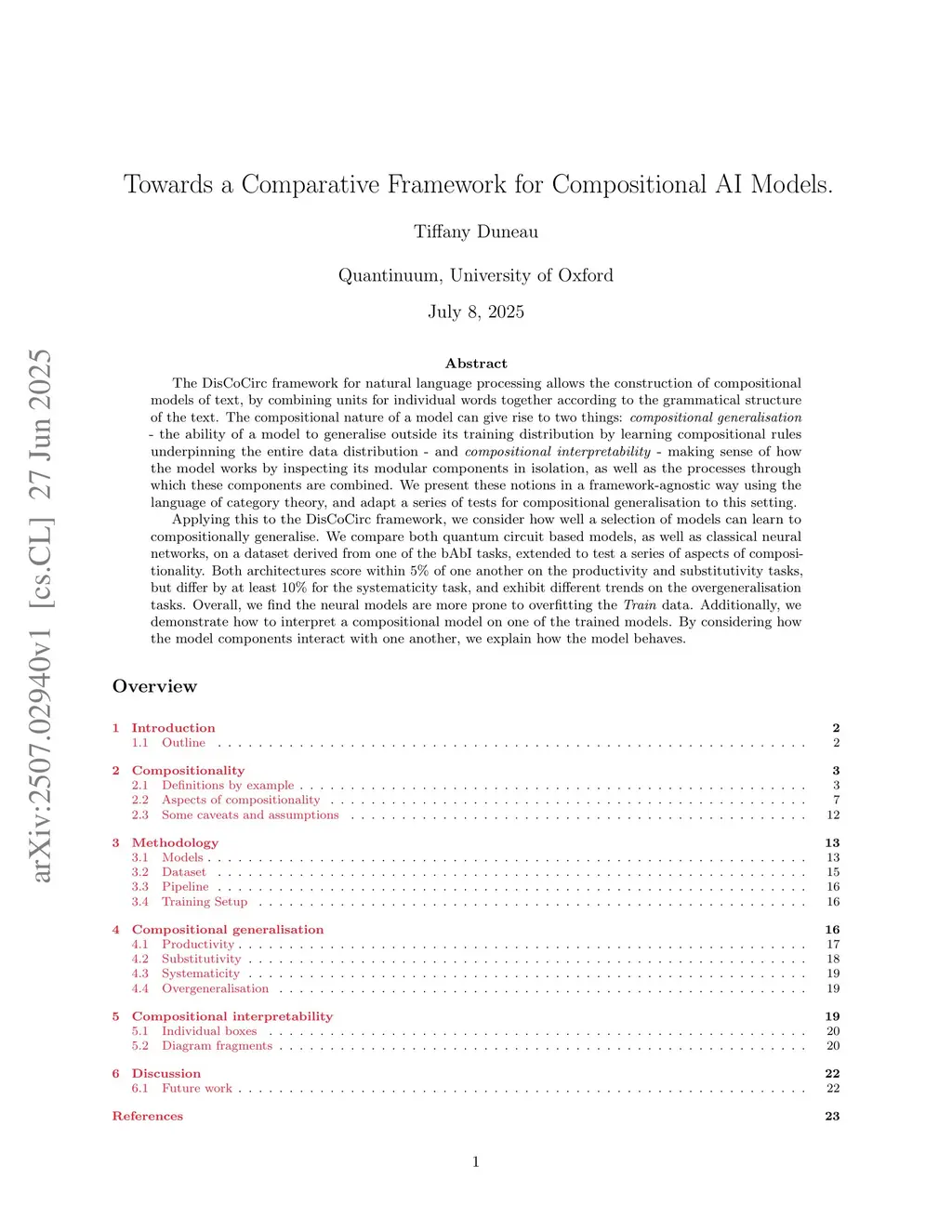 The DisCoCirc framework for natural language processing allows the construction of compositional models of text, by combining units for individual words together according to the grammatical structure of the text. The compositional nature of a model can give rise to two things: compositional generalisation -- the ability of a model to generalise outside its training distribution by learning compositional rules underpinning the entire data distribution -- and compositional interpretability -- making sense of how the model works by inspecting its modular components in isolation, as well as the processes through which these components are combined. We present these notions in a framework-agnostic way using the language of category theory, and adapt a series of tests for compositional generalisation to this setting.Applying this to the DisCoCirc framework, we consider how well a selection of models can learn to compositionally generalise. We compare both quantum circuit based models, as well as classical neural networks, on a dataset derived from one of the bAbI tasks, extended to test a series of aspects of compositionality. Both architectures score within 5% of one another on the productivity and substitutivity tasks, but differ by at least 10% for the systematicity task, and exhibit different trends on the overgeneralisation tasks. Overall, we find the neural models are more prone to overfitting the Train data. Additionally, we demonstrate how to interpret a compositional model on one of the trained models. By considering how the model components interact with one another, we explain how the model behaves.