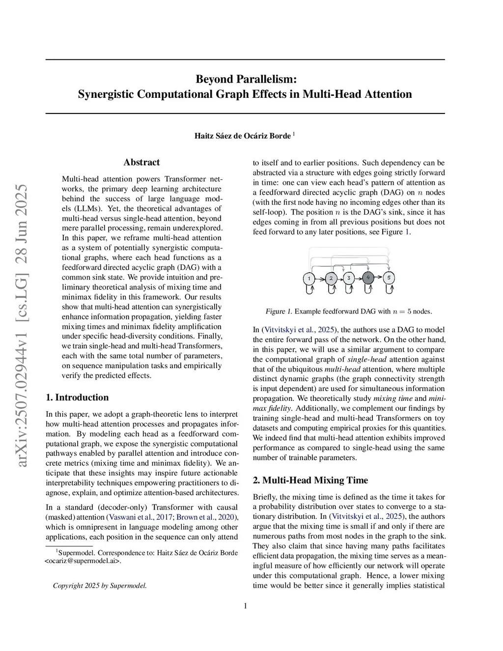 Multi-head attention powers Transformer networks, the primary deep learning architecture behind the success of large language models (LLMs). Yet, the theoretical advantages of multi-head versus single-head attention, beyond mere parallel processing, remain underexplored. In this paper, we reframe multi-head attention as a system of potentially synergistic computational graphs, where each head functions as a feedforward directed acyclic graph (DAG) with a common sink state. We provide intuition and preliminary theoretical analysis of mixing time and minimax fidelity in this framework. Our results show that multi-head attention can synergistically enhance information propagation, yielding faster mixing times and minimax fidelity amplification under specific head-diversity conditions. Finally, we train single-head and multi-head Transformers, each with the same total number of parameters, on sequence manipulation tasks and empirically verify the predicted effects. The code is available atthis https URL.