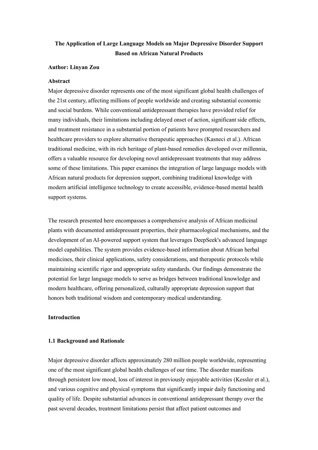 Major depressive disorder represents one of the most significant global health challenges of the 21st century, affecting millions of people worldwide and creating substantial economic and social burdens. While conventional antidepressant therapies have provided relief for many individuals, their limitations including delayed onset of action, significant side effects, and treatment resistance in a substantial portion of patients have prompted researchers and healthcare providers to explore alternative therapeutic approaches (Kasneci et al.). African traditional medicine, with its rich heritage of plant-based remedies developed over millennia, offers a valuable resource for developing novel antidepressant treatments that may address some of these limitations. This paper examines the integration of large language models with African natural products for depression support, combining traditional knowledge with modern artificial intelligence technology to create accessible, evidence-based mental health support systems.The research presented here encompasses a comprehensive analysis of African medicinal plants with documented antidepressant properties, their pharmacological mechanisms, and the development of an AI-powered support system that leverages DeepSeek's advanced language model capabilities. The system provides evidence-based information about African herbal medicines, their clinical applications, safety considerations, and therapeutic protocols while maintaining scientific rigor and appropriate safety standards. Our findings demonstrate the potential for large language models to serve as bridges between traditional knowledge and modern healthcare, offering personalized, culturally appropriate depression support that honors both traditional wisdom and contemporary medical understanding.