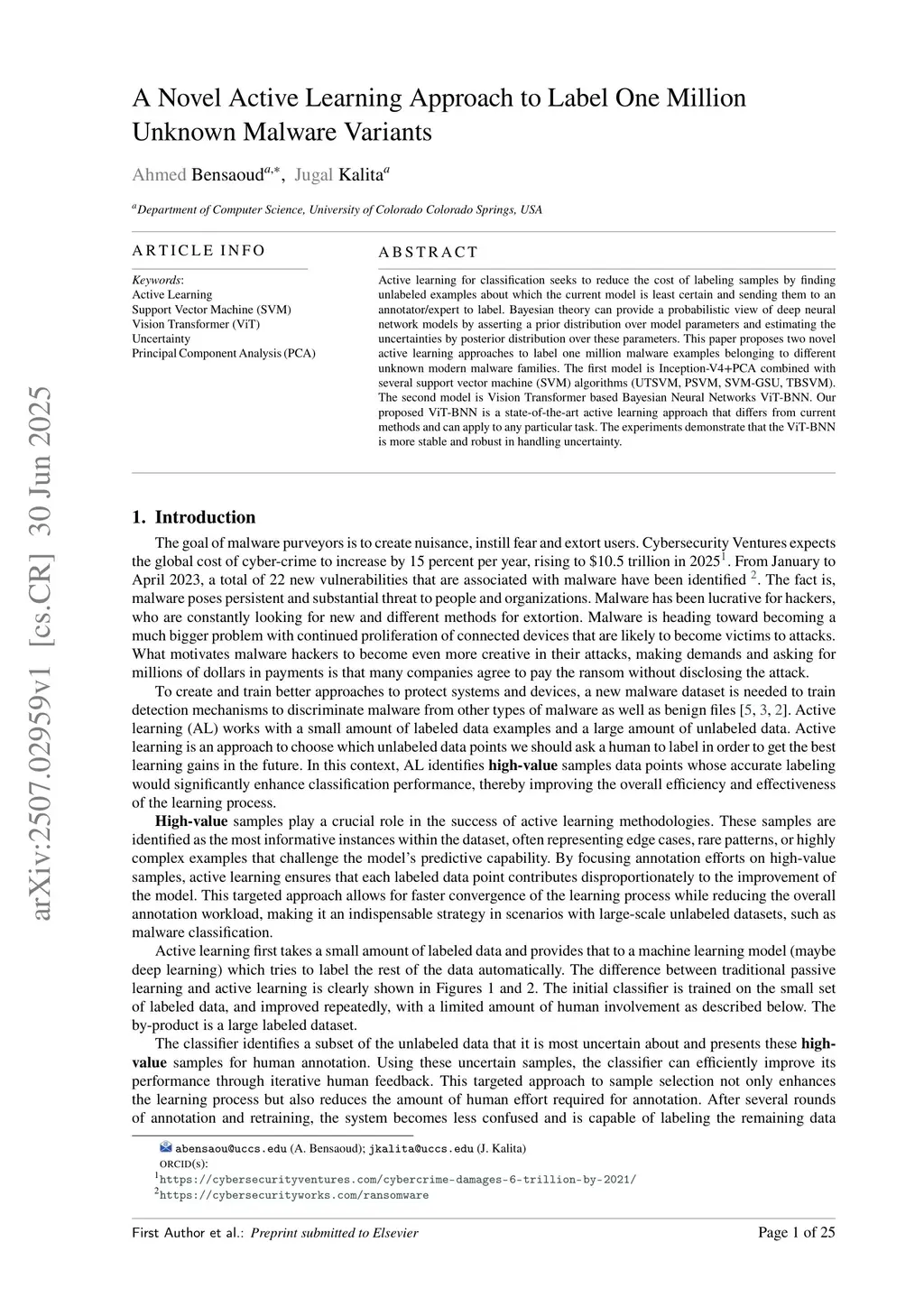 Active learning for classification seeks to reduce the cost of labeling samples by finding unlabeled examples about which the current model is least certain and sending them to an annotator/expert to label. Bayesian theory can provide a probabilistic view of deep neural network models by asserting a prior distribution over model parameters and estimating the uncertainties by posterior distribution over these parameters. This paper proposes two novel active learning approaches to label one million malware examples belonging to different unknown modern malware families. The first model is Inception-V4+PCA combined with several support vector machine (SVM) algorithms (UTSVM, PSVM, SVM-GSU, TBSVM). The second model is Vision Transformer based Bayesian Neural Networks ViT-BNN. Our proposed ViT-BNN is a state-of-the-art active learning approach that differs from current methods and can apply to any particular task. The experiments demonstrate that the ViT-BNN is more stable and robust in handling uncertainty.