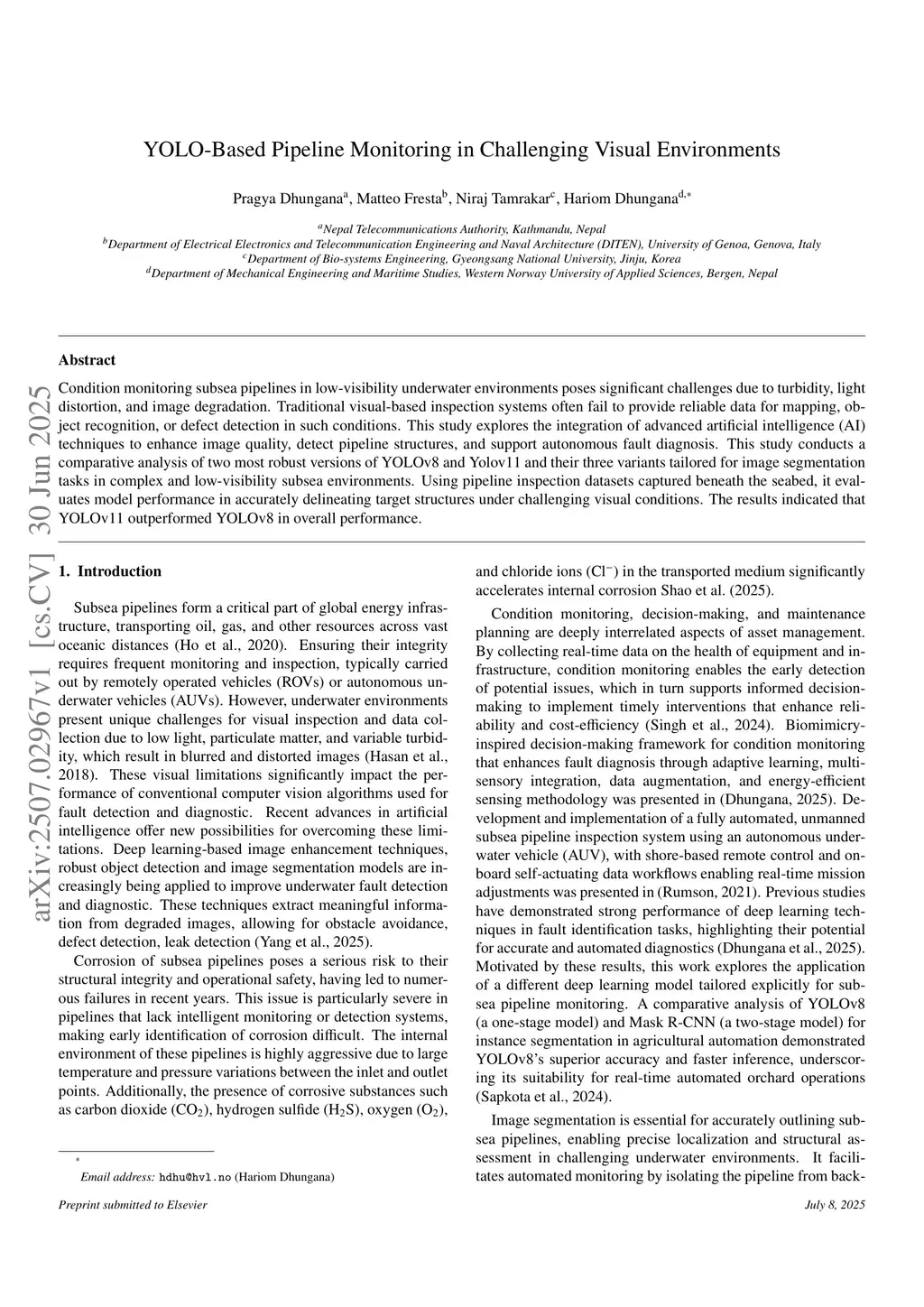 Condition monitoring subsea pipelines in low-visibility underwater environments poses significant challenges due to turbidity, light distortion, and image degradation. Traditional visual-based inspection systems often fail to provide reliable data for mapping, object recognition, or defect detection in such conditions. This study explores the integration of advanced artificial intelligence (AI) techniques to enhance image quality, detect pipeline structures, and support autonomous fault diagnosis. This study conducts a comparative analysis of two most robust versions of YOLOv8 and Yolov11 and their three variants tailored for image segmentation tasks in complex and low-visibility subsea environments. Using pipeline inspection datasets captured beneath the seabed, it evaluates model performance in accurately delineating target structures under challenging visual conditions. The results indicated that YOLOv11 outperformed YOLOv8 in overall performance.