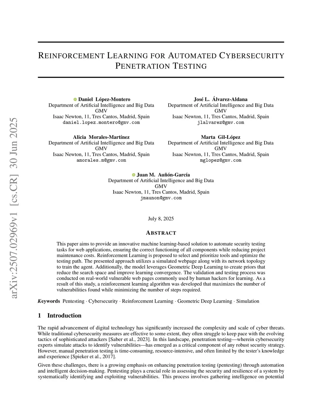 This paper aims to provide an innovative machine learning-based solution to automate security testing tasks for web applications, ensuring the correct functioning of all components while reducing project maintenance costs. Reinforcement Learning is proposed to select and prioritize tools and optimize the testing path. The presented approach utilizes a simulated webpage along with its network topology to train the agent. Additionally, the model leverages Geometric Deep Learning to create priors that reduce the search space and improve learning convergence. The validation and testing process was conducted on real-world vulnerable web pages commonly used by human hackers for learning. As a result of this study, a reinforcement learning algorithm was developed that maximizes the number of vulnerabilities found while minimizing the number of steps required