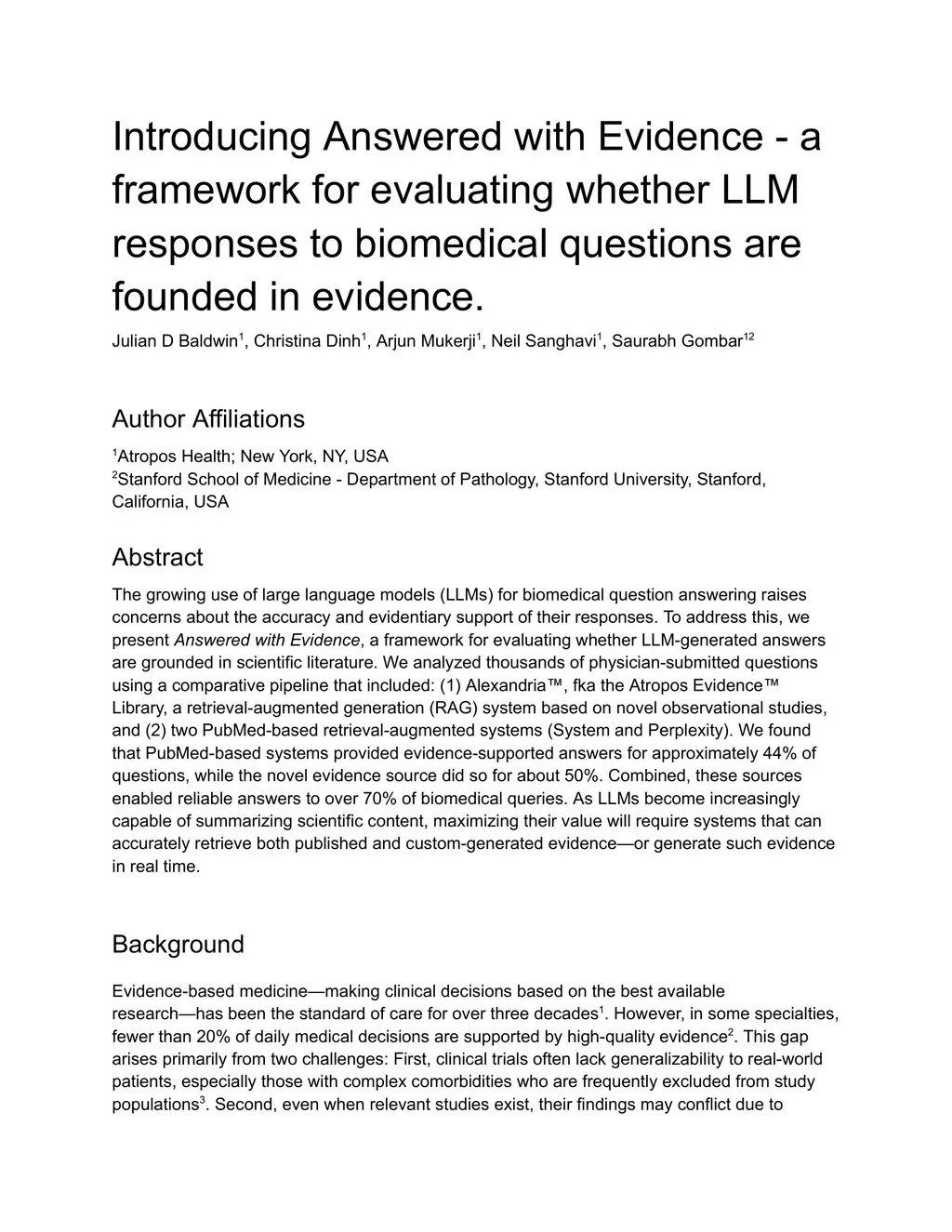 The growing use of large language models (LLMs) for biomedical question answering raises concerns about the accuracy and evidentiary support of their responses. To address this, we present Answered with Evidence, a framework for evaluating whether LLM-generated answers are grounded in scientific literature. We analyzed thousands of physician-submitted questions using a comparative pipeline that included: (1) Alexandria, fka the Atropos Evidence Library, a retrieval-augmented generation (RAG) system based on novel observational studies, and (2) two PubMed-based retrieval-augmented systems (System and Perplexity). We found that PubMed-based systems provided evidence-supported answers for approximately 44% of questions, while the novel evidence source did so for about 50%. Combined, these sources enabled reliable answers to over 70% of biomedical queries. As LLMs become increasingly capable of summarizing scientific content, maximizing their value will require systems that can accurately retrieve both published and custom-generated evidence or generate such evidence in real time.