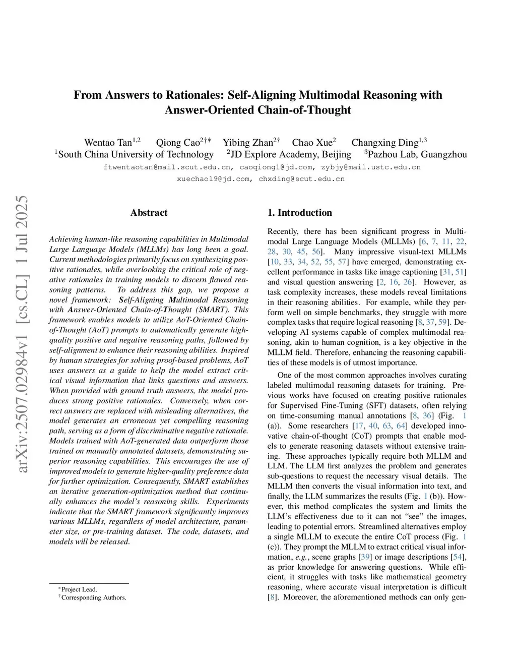 Achieving human-like reasoning capabilities in Multimodal Large Language Models (MLLMs) has long been a goal. Current methods primarily focus on synthesizing positive rationales, typically relying on manual annotations or complex systems. Moreover, they often overlook negative reasoning, which limits the model's generalization ability and robustness in multimodal inference. To address this gap, we propose a novel framework: \textbf{S}elf-Aligning \textbf{M}ultimodal Reasoning with \textbf{A}nswer-O\textbf{r}iented Chain-of-\textbf{T}hought (SMART). SMART employs an answer-oriented chain-of-thought (AoT) prompt to automatically construct high-quality data. Drawing inspiration from human proof-based strategies, AoT leverages both correct and incorrect answers to extract key visual information that links questions and answers. When provided with correct answers, the model produces strong positive rationales. Conversely, when correct answers are replaced with incorrect alternatives, the model generates an erroneous yet compelling reasoning path, serving as a form of discriminative negative rationale. Models trained with AoT-generated data outperform those trained on manually annotated datasets, demonstrating superior reasoning capabilities. Consequently, SMART establishes an iterative generation-optimization method that continually enhances the model's reasoning skills. Experiments indicate that the SMART framework significantly improves various MLLMs, regardless of model architecture, parameter size, or pre-training dataset. The code is available atthis https URL.