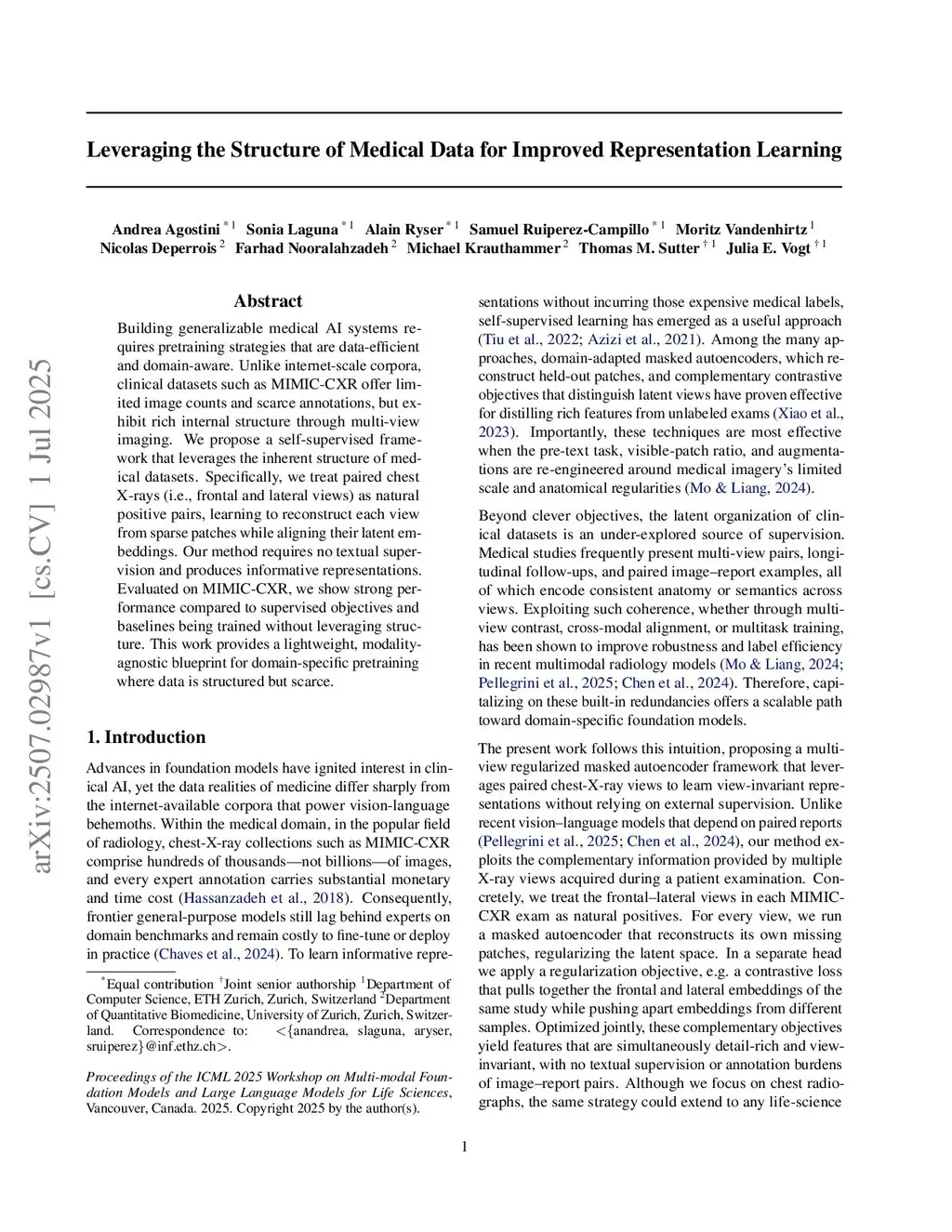 Building generalizable medical AI systems requires pretraining strategies that are data-efficient and domain-aware. Unlike internet-scale corpora, clinical datasets such as MIMIC-CXR offer limited image counts and scarce annotations, but exhibit rich internal structure through multi-view imaging. We propose a self-supervised framework that leverages the inherent structure of medical datasets. Specifically, we treat paired chest X-rays (i.e., frontal and lateral views) as natural positive pairs, learning to reconstruct each view from sparse patches while aligning their latent embeddings. Our method requires no textual supervision and produces informative representations. Evaluated on MIMIC-CXR, we show strong performance compared to supervised objectives and baselines being trained without leveraging structure. This work provides a lightweight, modality-agnostic blueprint for domain-specific pretraining where data is structured but scarce
