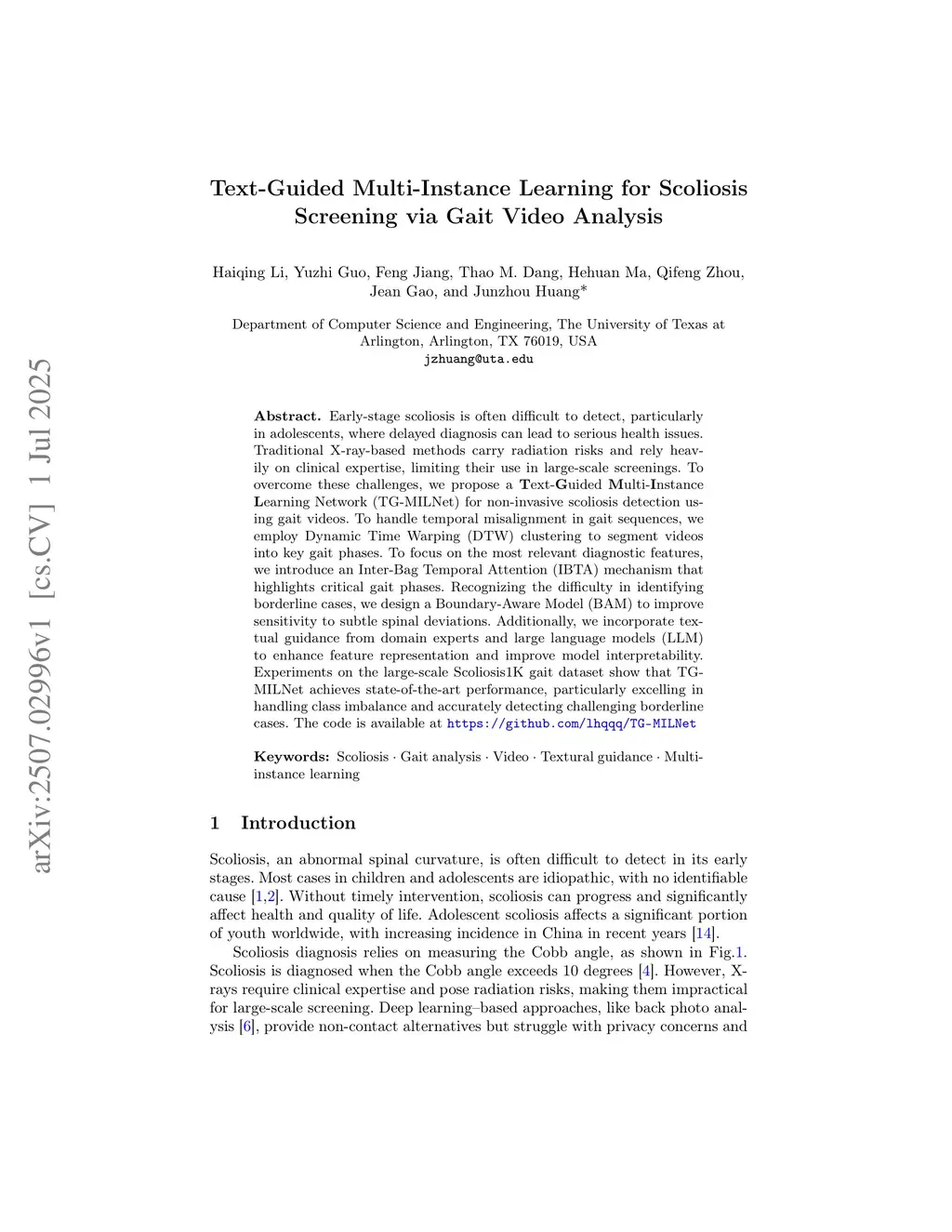 Early-stage scoliosis is often difficult to detect, particularly in adolescents, where delayed diagnosis can lead to serious health issues. Traditional X-ray-based methods carry radiation risks and rely heavily on clinical expertise, limiting their use in large-scale screenings. To overcome these challenges, we propose a Text-Guided Multi-Instance Learning Network (TG-MILNet) for non-invasive scoliosis detection using gait videos. To handle temporal misalignment in gait sequences, we employ Dynamic Time Warping (DTW) clustering to segment videos into key gait phases. To focus on the most relevant diagnostic features, we introduce an Inter-Bag Temporal Attention (IBTA) mechanism that highlights critical gait phases. Recognizing the difficulty in identifying borderline cases, we design a Boundary-Aware Model (BAM) to improve sensitivity to subtle spinal deviations. Additionally, we incorporate textual guidance from domain experts and large language models (LLM) to enhance feature representation and improve model interpretability. Experiments on the large-scale Scoliosis1K gait dataset show that TG-MILNet achieves state-of-the-art performance, particularly excelling in handling class imbalance and accurately detecting challenging borderline cases. The code is available atthis https URL
