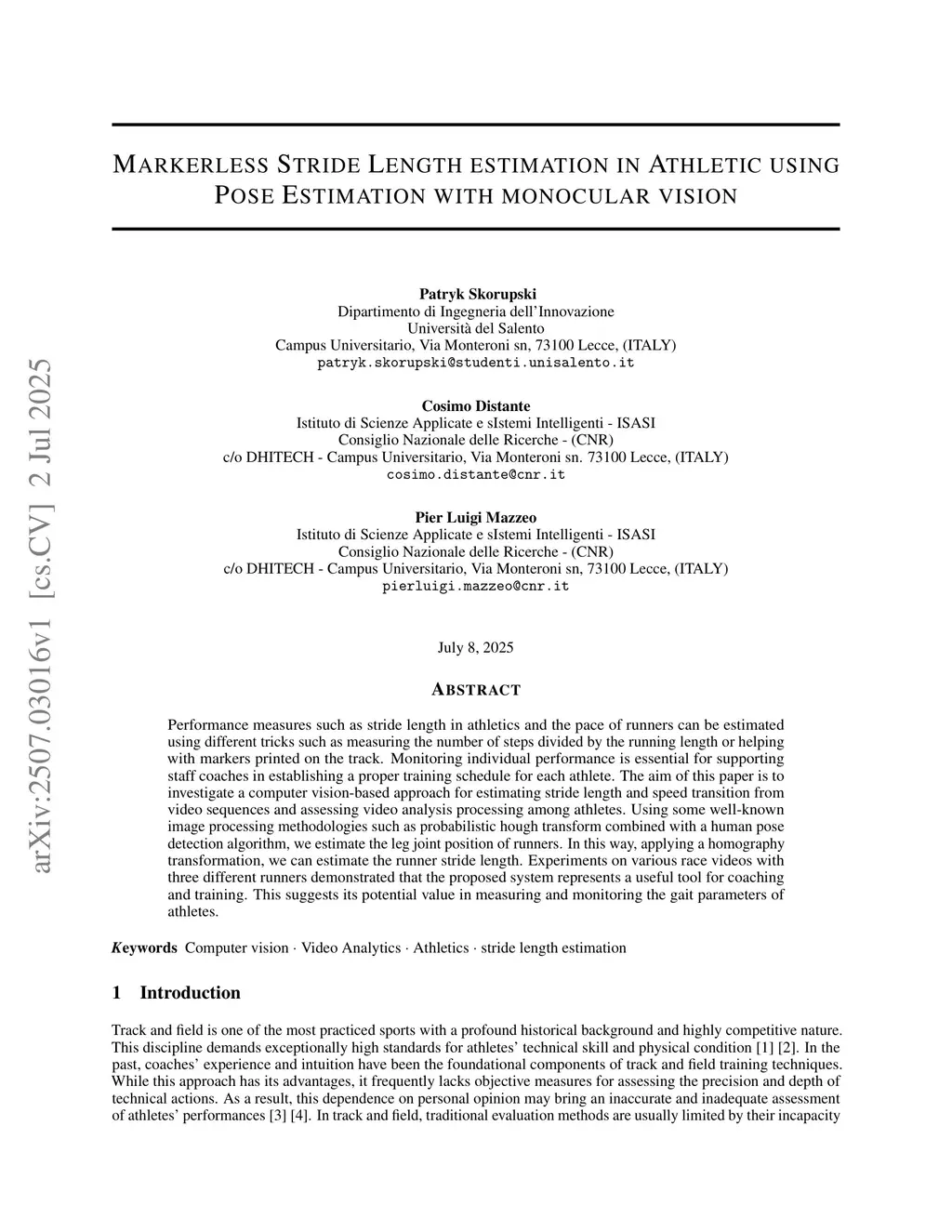 Performance measures such as stride length in athletics and the pace of runners can be estimated using different tricks such as measuring the number of steps divided by the running length or helping with markers printed on the track. Monitoring individual performance is essential for supporting staff coaches in establishing a proper training schedule for each athlete. The aim of this paper is to investigate a computer vision-based approach for estimating stride length and speed transition from video sequences and assessing video analysis processing among athletes. Using some well-known image processing methodologies such as probabilistic hough transform combined with a human pose detection algorithm, we estimate the leg joint position of runners. In this way, applying a homography transformation, we can estimate the runner stride length. Experiments on various race videos with three different runners demonstrated that the proposed system represents a useful tool for coaching and training. This suggests its potential value in measuring and monitoring the gait parameters of athletes.