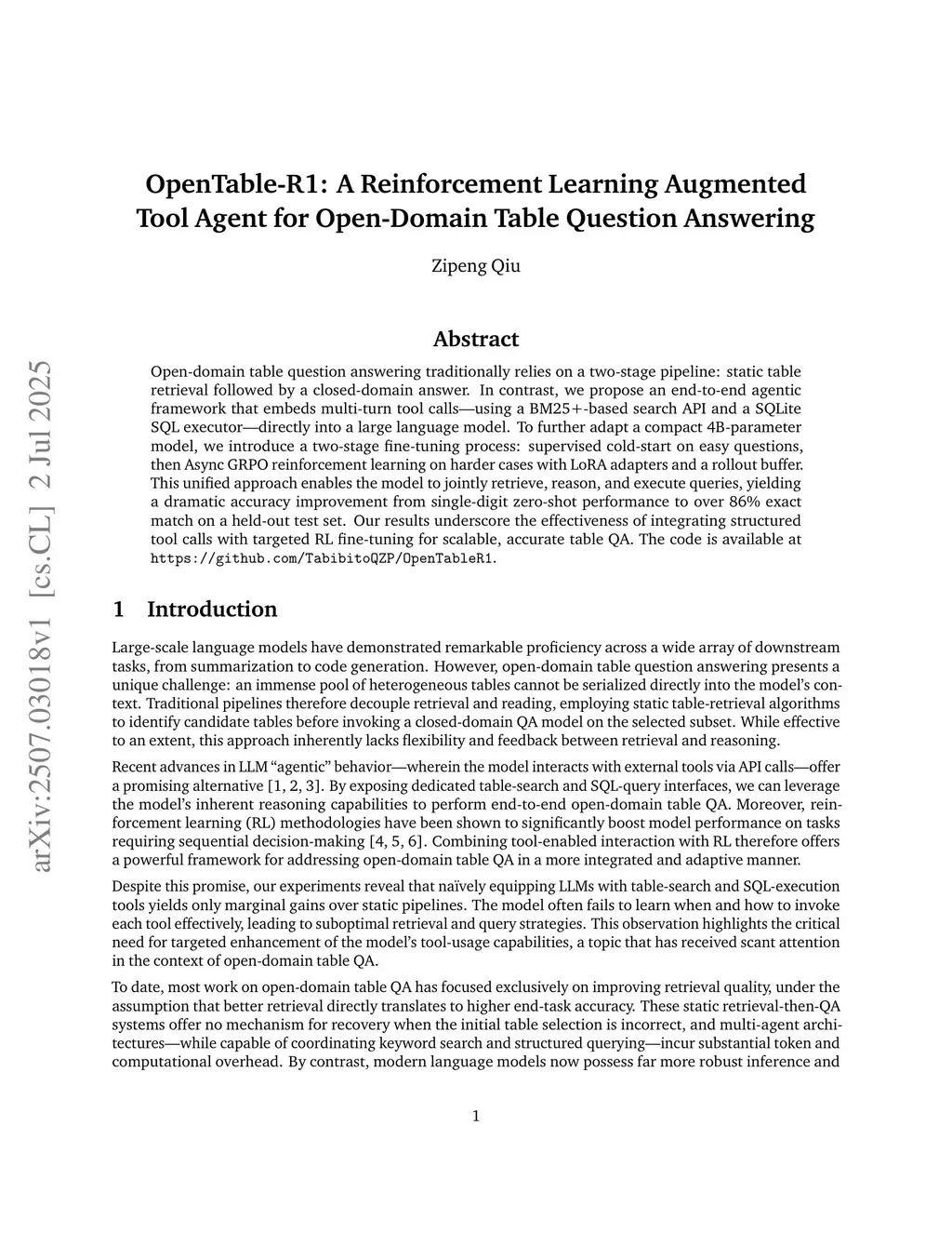 Open-domain table question answering traditionally relies on a two-stage pipeline: static table retrieval followed by a closed-domain answer. In contrast, we propose an end-to-end agentic framework that embeds multi-turn tool calls-using a BM25+-based search API and a SQLite SQL executor-directly into a large language model. To further adapt a compact 4B-parameter model, we introduce a two-stage fine-tuning process: supervised cold-start on easy questions, then Async GRPO reinforcement learning on harder cases with LoRA adapters and a rollout buffer. This unified approach enables the model to jointly retrieve, reason, and execute queries, yielding a dramatic accuracy improvement from single-digit zero-shot performance to over 0.86 exact match on a held-out test set. Our results underscore the effectiveness of integrating structured tool calls with targeted RL fine-tuning for scalable, accurate table QA. The code is available atthis https URL.