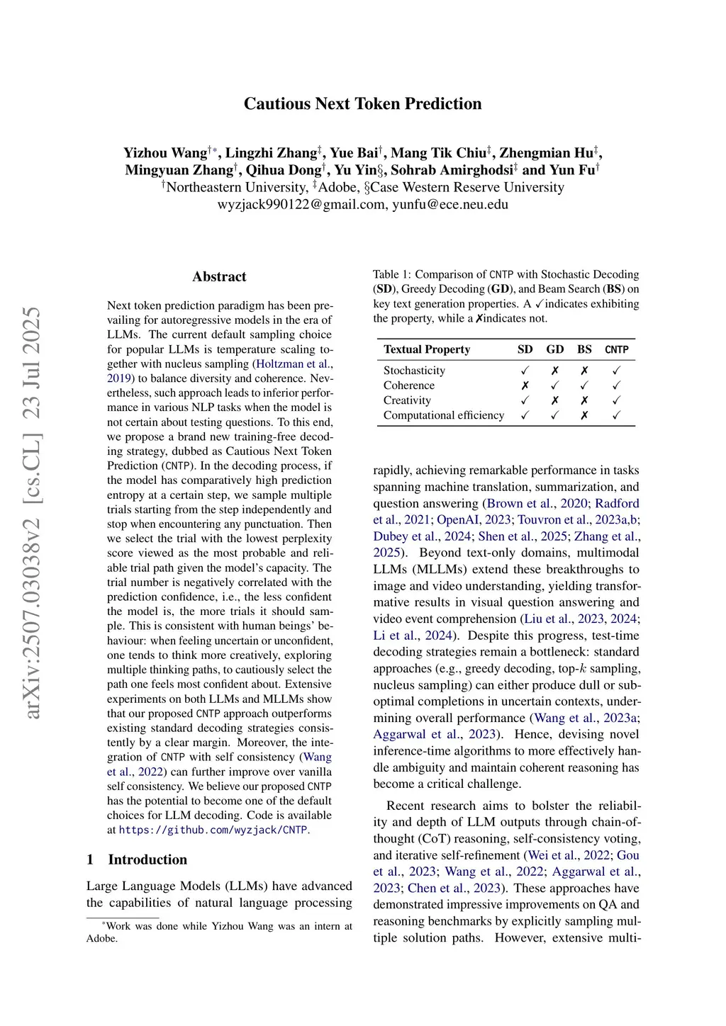 Next token prediction paradigm has been prevailing for autoregressive models in the era of LLMs. The current default sampling choice for popular LLMs is temperature scaling together with nucleus sampling to balance diversity and coherence. Nevertheless, such approach leads to inferior performance in various NLP tasks when the model is not certain about testing questions. To this end, we propose a brand new training-free decoding strategy, dubbed as Cautious Next Token Prediction (CNTP). In the decoding process, if the model has comparatively high prediction entropy at a certain step, we sample multiple trials starting from the step independently and stop when encountering any punctuation. Then we select the trial with the lowest perplexity score viewed as the most probable and reliable trial path given the model's capacity. The trial number is negatively correlated with the prediction confidence, i.e., the less confident the model is, the more trials it should sample. This is consistent with human beings' behaviour: when feeling uncertain or unconfident, one tends to think more creatively, exploring multiple thinking paths, to cautiously select the path one feels most confident about. Extensive experiments on both LLMs and MLLMs show that our proposed CNTP approach outperforms existing standard decoding strategies consistently by a clear margin. Moreover, the integration of CNTP with self consistency can further improve over vanilla self consistency. We believe our proposed CNTP has the potential to become one of the default choices for LLM decoding. Code is available atthis https URL.