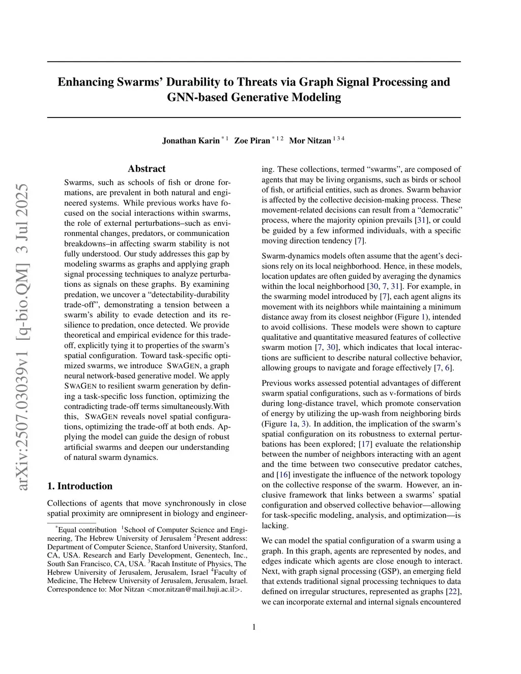 Swarms, such as schools of fish or drone formations, are prevalent in both natural and engineered systems. While previous works have focused on the social interactions within swarms, the role of external perturbations--such as environmental changes, predators, or communication breakdowns--in affecting swarm stability is not fully understood. Our study addresses this gap by modeling swarms as graphs and applying graph signal processing techniques to analyze perturbations as signals on these graphs. By examining predation, we uncover a "detectability-durability trade-off", demonstrating a tension between a swarm's ability to evade detection and its resilience to predation, once detected. We provide theoretical and empirical evidence for this trade-off, explicitly tying it to properties of the swarm's spatial configuration. Toward task-specific optimized swarms, we introduce SwaGen, a graph neural network-based generative model. We apply SwaGen to resilient swarm generation by defining a task-specific loss function, optimizing the contradicting trade-off termsthis http URLthis, SwaGen reveals novel spatial configurations, optimizing the trade-off at both ends. Applying the model can guide the design of robust artificial swarms and deepen our understanding of natural swarm dynamics.