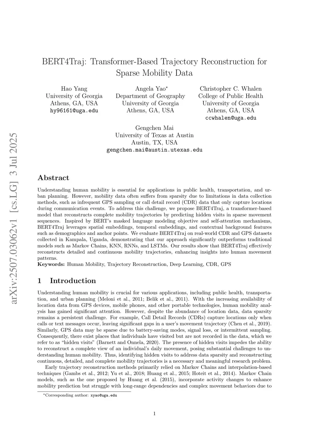 Understanding human mobility is essential for applications in public health, transportation, and urban planning. However, mobility data often suffers from sparsity due to limitations in data collection methods, such as infrequent GPS sampling or call detail record (CDR) data that only capture locations during communication events. To address this challenge, we propose BERT4Traj, a transformer based model that reconstructs complete mobility trajectories by predicting hidden visits in sparse movement sequences. Inspired by BERT's masked language modeling objective and self_attention mechanisms, BERT4Traj leverages spatial embeddings, temporal embeddings, and contextual background features such as demographics and anchor points. We evaluate BERT4Traj on real world CDR and GPS datasets collected in Kampala, Uganda, demonstrating that our approach significantly outperforms traditional models such as Markov Chains, KNN, RNNs, and LSTMs. Our results show that BERT4Traj effectively reconstructs detailed and continuous mobility trajectories, enhancing insights into human movement patterns.
