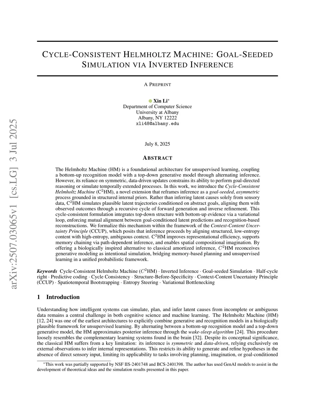 The Helmholtz Machine (HM) is a foundational architecture for unsupervised learning, coupling a bottom-up recognition model with a top-down generative model through alternating inference. However, its reliance on symmetric, data-driven updates constrains its ability to perform goal-directed reasoning or simulate temporally extended processes. In this work, we introduce the \emph{Cycle-Consistent Helmholtz Machine} (CHM), a novel extension that reframes inference as a \emph{goal-seeded}, \emph{asymmetric} process grounded in structured internal priors. Rather than inferring latent causes solely from sensory data, CHM simulates plausible latent trajectories conditioned on abstract goals, aligning them with observed outcomes through a recursive cycle of forward generation and inverse refinement. This cycle-consistent formulation integrates top-down structure with bottom-up evidence via a variational loop, enforcing mutual alignment between goal-conditioned latent predictions and recognition-based reconstructions. We formalize this mechanism within the framework of the \emph{Context-Content Uncertainty Principle} (CCUP), which posits that inference proceeds by aligning structured, low-entropy content with high-entropy, ambiguous context. CHM improves representational efficiency, supports memory chaining via path-dependent inference, and enables spatial compositional imagination. By offering a biologically inspired alternative to classical amortized inference, HM reconceives generative modeling as intentional simulation, bridging memory-based planning and unsupervised learning in a unified probabilistic framework.