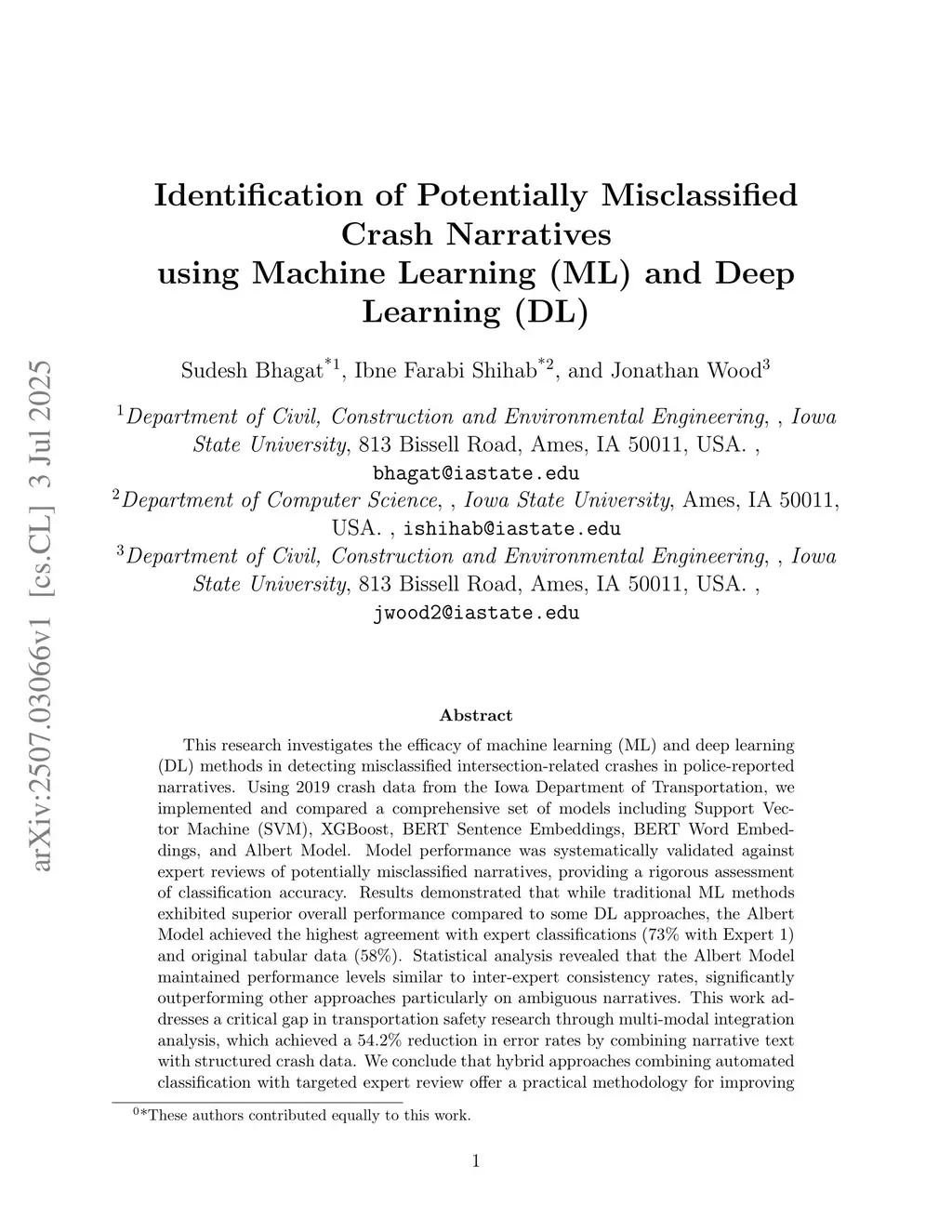 This research investigates the efficacy of machine learning (ML) and deep learning (DL) methods in detecting misclassified intersection-related crashes in police-reported narratives. Using 2019 crash data from the Iowa Department of Transportation, we implemented and compared a comprehensive set of models, including Support Vector Machine (SVM), XGBoost, BERT Sentence Embeddings, BERT Word Embeddings, and Albert Model. Model performance was systematically validated against expert reviews of potentially misclassified narratives, providing a rigorous assessment of classification accuracy. Results demonstrated that while traditional ML methods exhibited superior overall performance compared to some DL approaches, the Albert Model achieved the highest agreement with expert classifications (73% with Expert 1) and original tabular data (58%). Statistical analysis revealed that the Albert Model maintained performance levels similar to inter-expert consistency rates, significantly outperforming other approaches, particularly on ambiguous narratives. This work addresses a critical gap in transportation safety research through multi-modal integration analysis, which achieved a 54.2% reduction in error rates by combining narrative text with structured crash data. We conclude that hybrid approaches combining automated classification with targeted expert review offer a practical methodology for improving crash data quality, with substantial implications for transportation safety management and policy development.