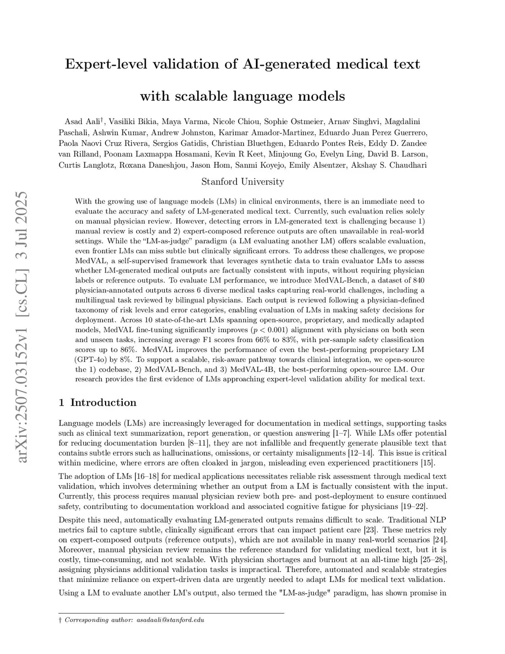 With the growing use of language models (LMs) in clinical environments, there is an immediate need to evaluate the accuracy and safety of LM-generated medical text. Currently, such evaluation relies solely on manual physician review. However, detecting errors in LM-generated text is challenging because 1) manual review is costly and 2) expert-composed reference outputs are often unavailable in real-world settings. While the "LM-as-judge" paradigm (a LM evaluating another LM) offers scalable evaluation, even frontier LMs can miss subtle but clinically significant errors. To address these challenges, we propose MedVAL, a self-supervised framework that leverages synthetic data to train evaluator LMs to assess whether LM-generated medical outputs are factually consistent with inputs, without requiring physician labels or reference outputs. To evaluate LM performance, we introduce MedVAL-Bench, a dataset containing 840 outputs annotated by physicians, following a physician-defined taxonomy of risk levels and error categories. Across 6 diverse medical tasks and 10 state-of-the-art LMs spanning open-source, proprietary, and medically adapted models, MedVAL fine-tuning significantly improves (p < 0.001) alignment with physicians on both seen and unseen tasks, increasing average F1 scores from 66% to 83%, with per-sample safety classification scores up to 86%. MedVAL improves the performance of even the best-performing proprietary LM (GPT-4o) by 8%. To support a scalable, risk-aware pathway towards clinical integration, we open-source the 1) codebase ( this https URL ), 2) MedVAL-Bench ( this https URL ), and 3) MedVAL-4B ( this https URL ), the best-performing open-source LM. Our research provides the first evidence of LMs approaching expert-level validation ability for medical text.