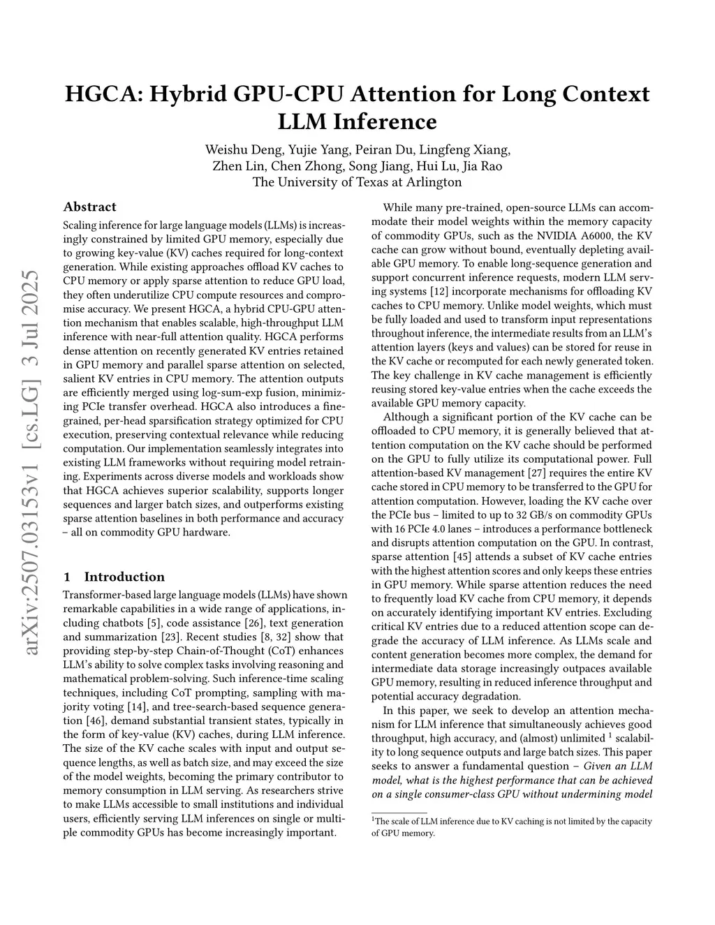 Scaling inference for large language models (LLMs) is increasingly constrained by limited GPU memory, especially due to growing key-value (KV) caches required for long-context generation. While existing approaches offload KV caches to CPU memory or apply sparse attention to reduce GPU load, they often underutilize CPU compute resources and compromise accuracy. We present HGCA, a hybrid CPU-GPU attention mechanism that enables scalable, high-throughput LLM inference with near-full attention quality. HGCA performs dense attention on recently generated KV entries retained in GPU memory and parallel sparse attention on selected, salient KV entries in CPU memory. The attention outputs are efficiently merged using log-sum-exp fusion, minimizing PCIe transfer overhead. HGCA also introduces a finegrained, per-head sparsification strategy optimized for CPU execution, preserving contextual relevance while reducing computation. Our implementation seamlessly integrates into existing LLM frameworks without requiring model retraining. Experiments across diverse models and workloads show that HGCA achieves superior scalability, supports longer sequences and larger batch sizes, and outperforms existing sparse attention baselines in both performance and accuracy -- all on commodity GPU hardware.