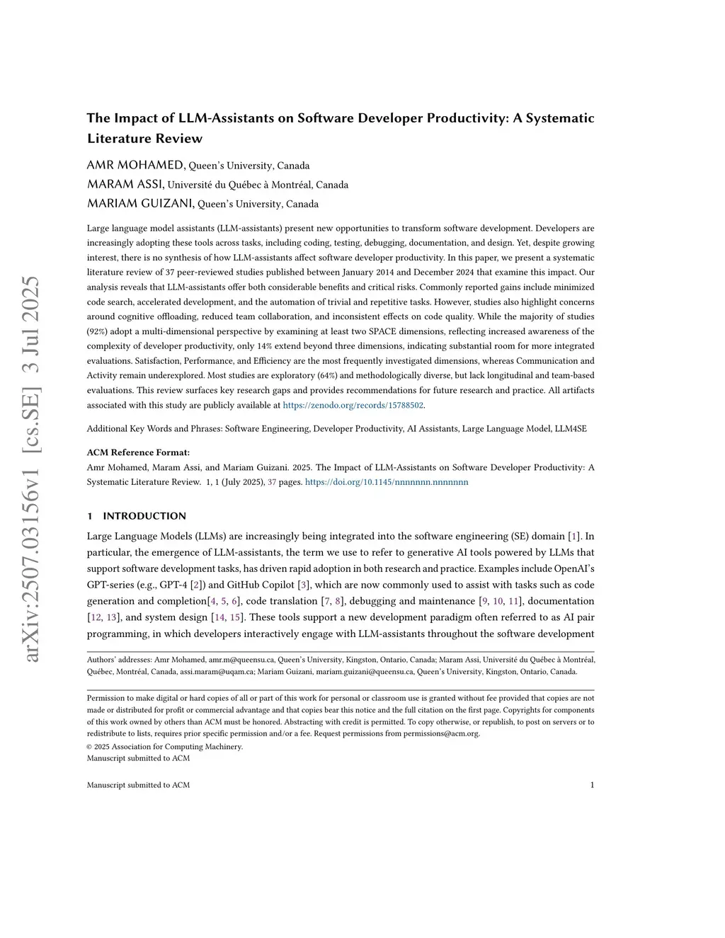 The Impact of LLM-Assistants on Software Developer Productivity: A Systematic Review and Mapping Study