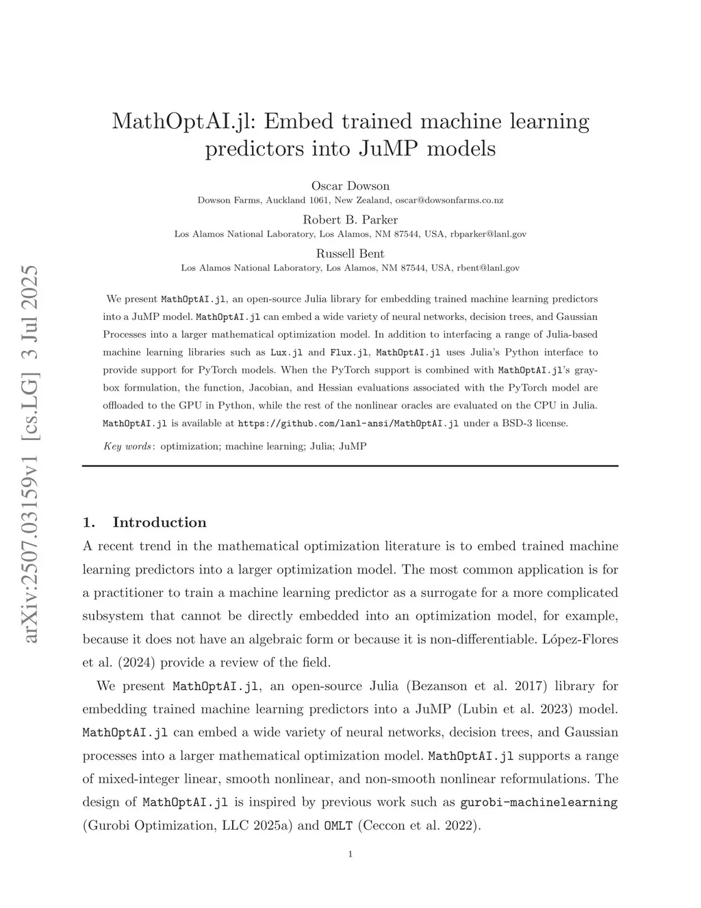 MathOptAI.jl: Embed trained machine learning predictors into JuMP models