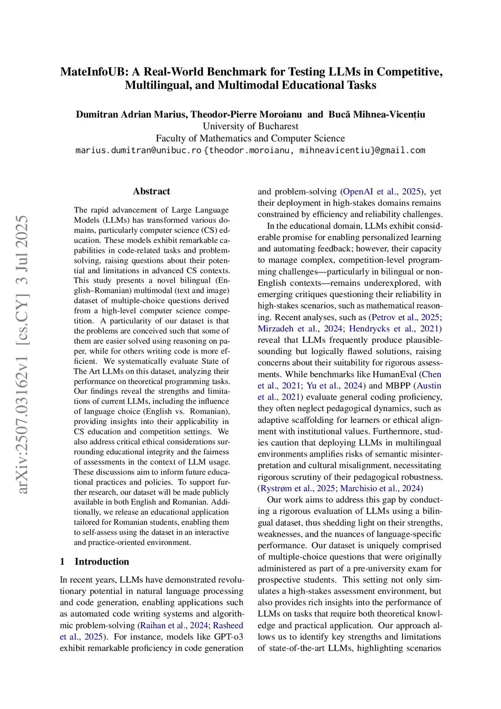The rapid advancement of Large Language Models (LLMs) has transformed various domains, particularly computer science (CS) education. These models exhibit remarkable capabilities in code-related tasks and problem-solving, raising questions about their potential and limitations in advanced CS contexts. This study presents a novel bilingual (English-Romanian) multimodal (text and image) dataset of multiple-choice questions derived from a high-level computer science competition. A particularity of our dataset is that the problems are conceived such that some of them are easier solved using reasoning on paper, while for others writing code is more efficient. We systematically evaluate State of The Art LLMs on this dataset, analyzing their performance on theoretical programming tasks. Our findings reveal the strengths and limitations of current LLMs, including the influence of language choice (English vs. Romanian), providing insights into their applicability in CS education and competition settings. We also address critical ethical considerations surrounding educational integrity and the fairness of assessments in the context of LLM usage. These discussions aim to inform future educational practices and policies. To support further research, our dataset will be made publicly available in both English and Romanian. Additionally, we release an educational application tailored for Romanian students, enabling them to self-assess using the dataset in an interactive and practice-oriented environment.