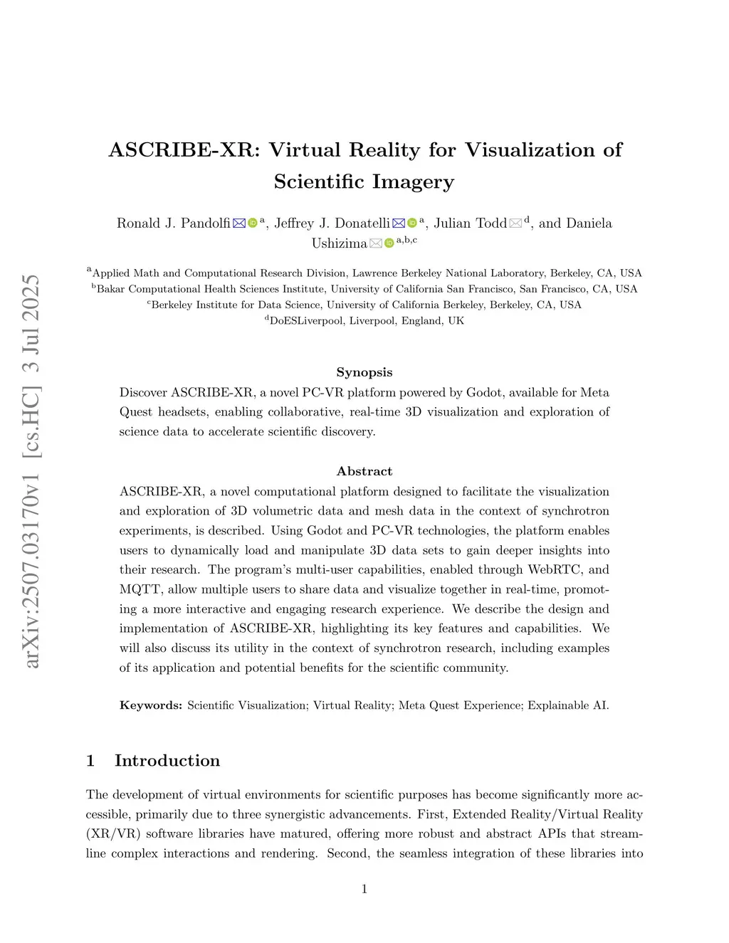 ASCRIBE-XR, a novel computational platform designed to facilitate the visualization and exploration of 3D volumetric data and mesh data in the context of synchrotron experiments, is described. Using Godot and PC-VR technologies, the platform enables users to dynamically load and manipulate 3D data sets to gain deeper insights into their research. The program's multi-user capabilities, enabled through WebRTC, and MQTT, allow multiple users to share data and visualize together in real-time, promoting a more interactive and engaging research experience. We describe the design and implementation of ASCRIBE-XR, highlighting its key features and capabilities. We will also discuss its utility in the context of synchrotron research, including examples of its application and potential benefits for the scientific community.