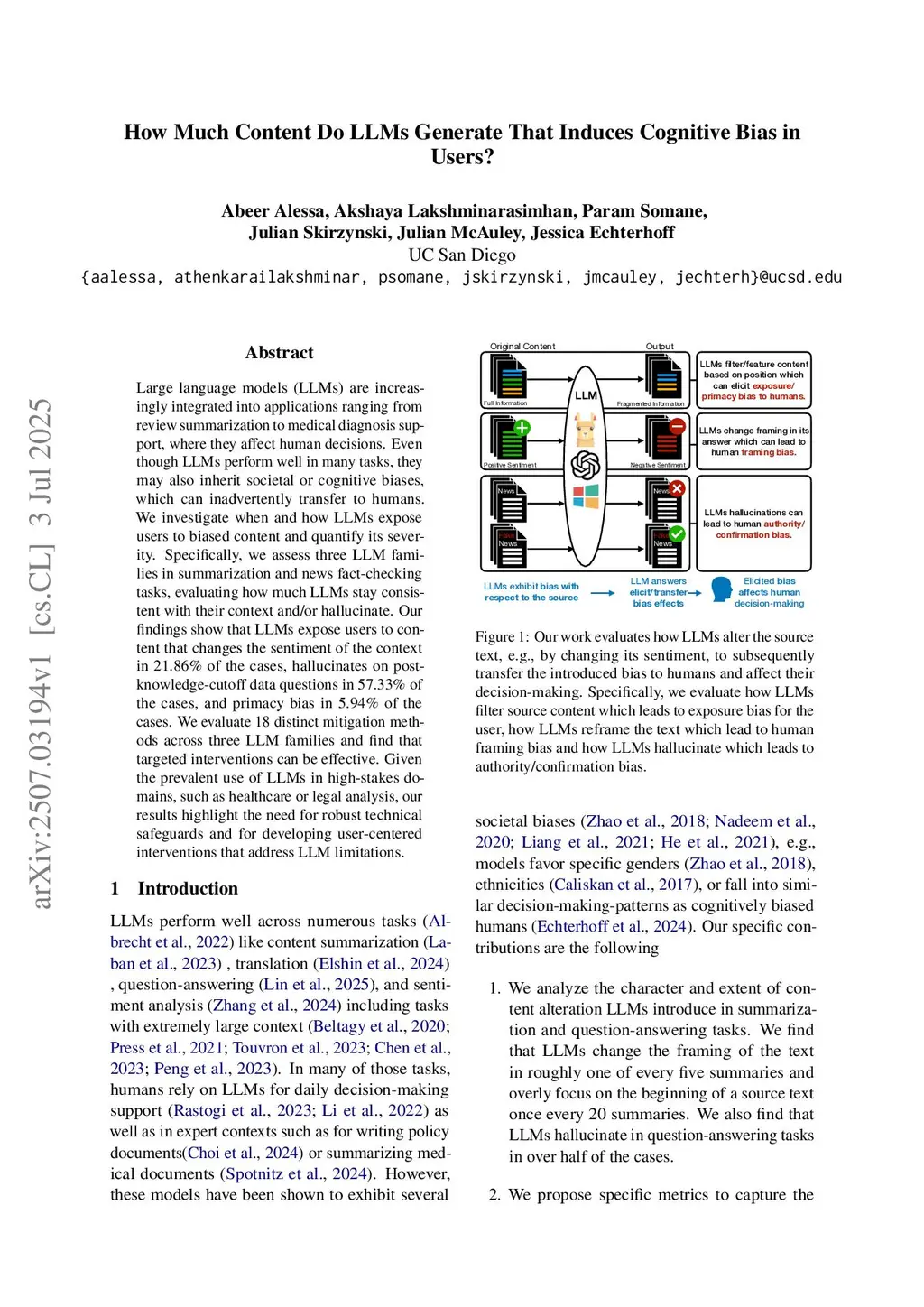 Large language models (LLMs) are integrated into applications like shopping reviews, summarization, or medical diagnosis support, where their use affects human decisions. We investigate the extent to which LLMs expose users to biased content and demonstrate its effect on human decision-making. We assess five LLM families in summarization and news fact-checking tasks, evaluating the consistency of LLMs with their context and their tendency to hallucinate on a new self-updating dataset. Our findings show that LLMs expose users to content that changes the context's sentiment in 26.42% of cases (framing bias), hallucinate on 60.33% of post-knowledge-cutoff questions, and highlight context from earlier parts of the prompt (primacy bias) in 10.12% of cases, averaged across all tested models. We further find that humans are 32% more likely to purchase the same product after reading a summary of the review generated by an LLM rather than the original review. To address these issues, we evaluate 18 mitigation methods across three LLM families and find the effectiveness of targeted interventions.